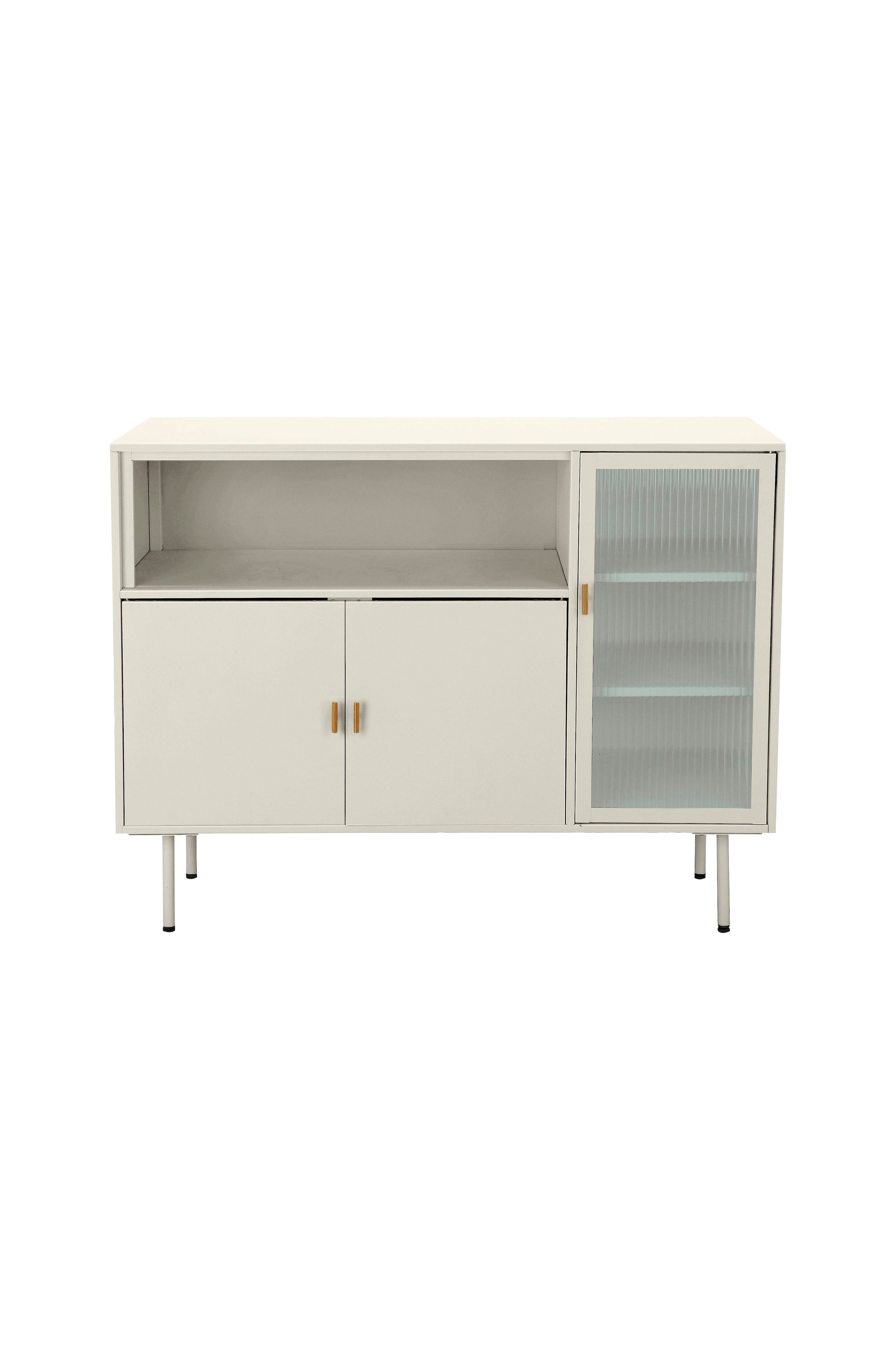 Uanset om det er i stuen, soveværelset eller entréen - med denne skænk med tre døre skaber du mere opbevaringsplads til din fladskærm eller smukke dekorative elementer. Den moderne skænk er lavet af jern og er derfor robust og holdbar. Den lakerede overflade ser ikke kun godt ud, men er også beregnet til at forhindre fugt i at trænge ind. Jernhåndtagene er stabile og bliver derfor ikke slidt så hurtigt. I glamourøs stil forvandler dette møbel ethvert rum til en lille scene. Brugen af skinnende highlights i guld eller sølv sikrer også en glamourøs opdatering. En dør med glasfront tilføjer en særlig accent til dette skab.