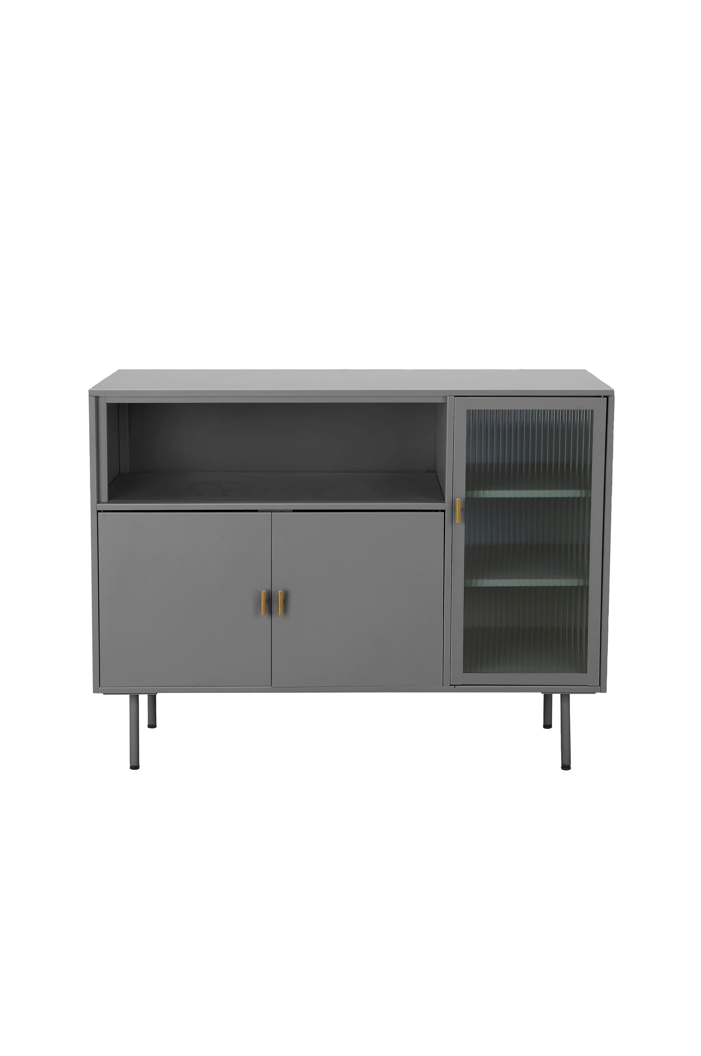 Uanset om det er i stuen, soveværelset eller entréen - med denne skænk med tre døre skaber du mere opbevaringsplads til din fladskærm eller smukke dekorative elementer. Den moderne skænk er lavet af jern og er derfor robust og holdbar. Den lakerede overflade ser ikke kun godt ud, men er også beregnet til at forhindre fugt i at trænge ind. Jernhåndtagene er stabile og bliver derfor ikke slidt så hurtigt. I glamourøs stil forvandler dette møbel ethvert rum til en lille scene. Brugen af skinnende highlights i guld eller sølv sikrer også en glamourøs opdatering. En dør med glasfront tilføjer en særlig accent til dette skab.