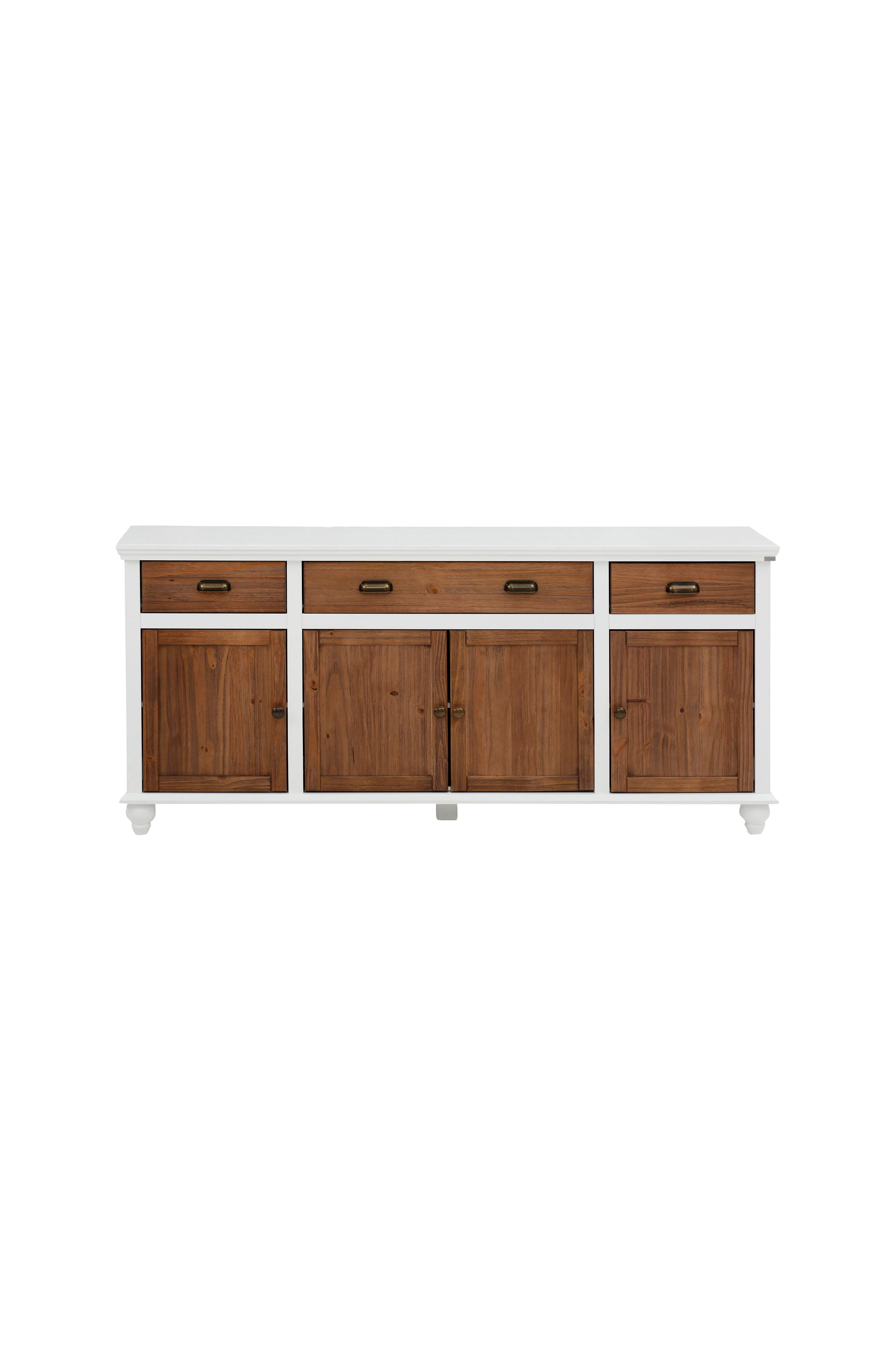Med sit moderne landhusdesign bliver den et blikfang i ethvert rum: den rummelige skænk. En hvid krop, døre og skuffer af massivt fyrretræ og brunlakerede, børstede fronter sikrer et harmonisk helhedsbillede. Skænken kan passe perfekt til dit hjem. Takket være den letplejelige overflade kan den rengøres hurtigt og ubesværet. Spil, bøger eller andre ting kan opbevares bag lågerne og i de rummelige skuffer. Der er plads nok på toppen til dit tv.