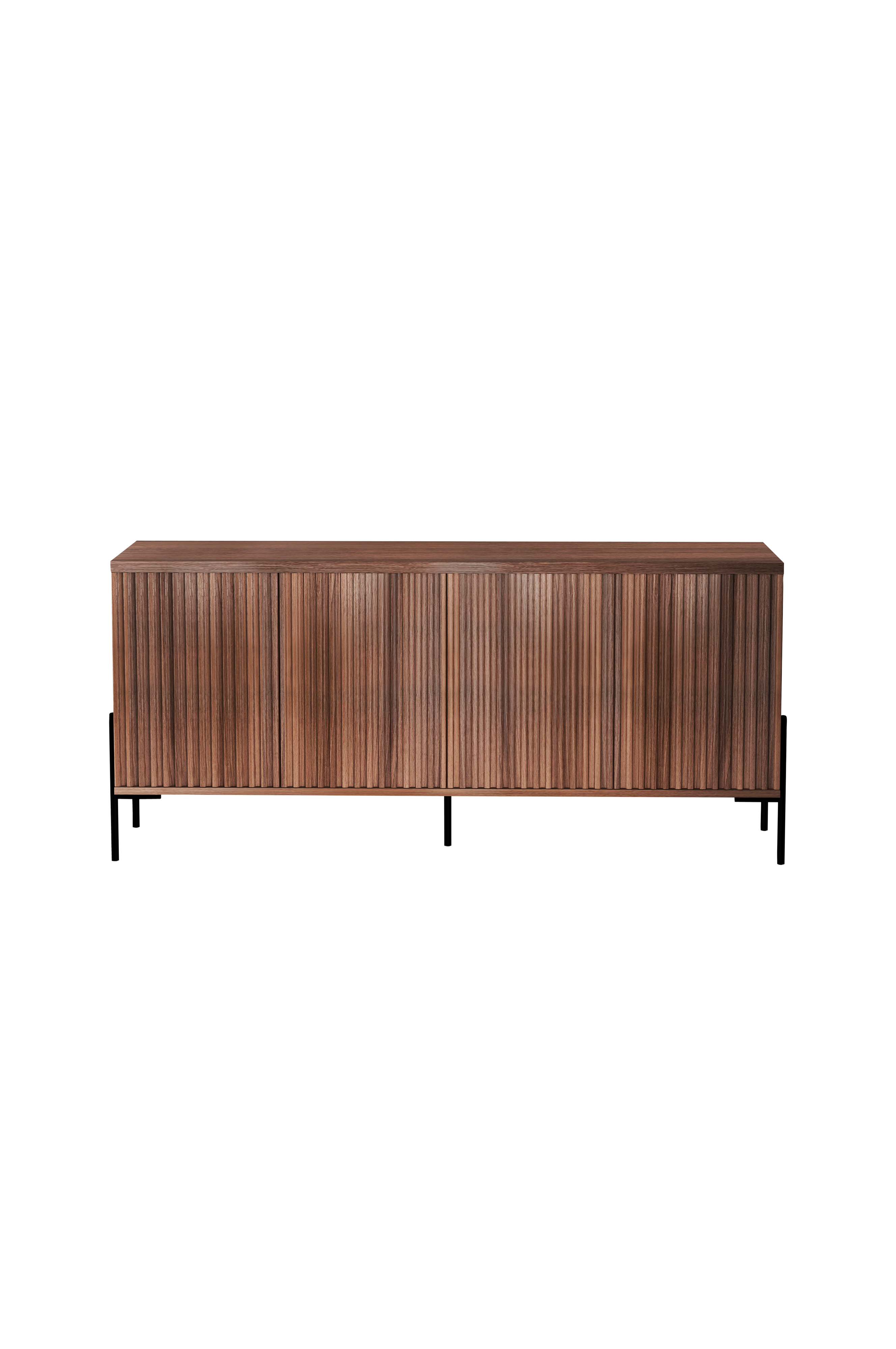 Skænken i høj kvalitet med push-to-open-funktion understreger den puristiske boligstemning i dit hjem. Den imponerer med sit attraktive trælook og sine flotte fronter med smukke årer. Smalle fødder afrunder designet og giver skænken en elegant accent. Bag en række låger finder du praktiske hylder, hvor tallerkener, bøger og boligtekstiler kan opbevares. Push-to-open-funktionen sikrer håndtagsfri åbning. Over skabet er der masser af plads til dekorative genstande som billedrammer eller lanterner. Det er fremstillet af robust mdf.