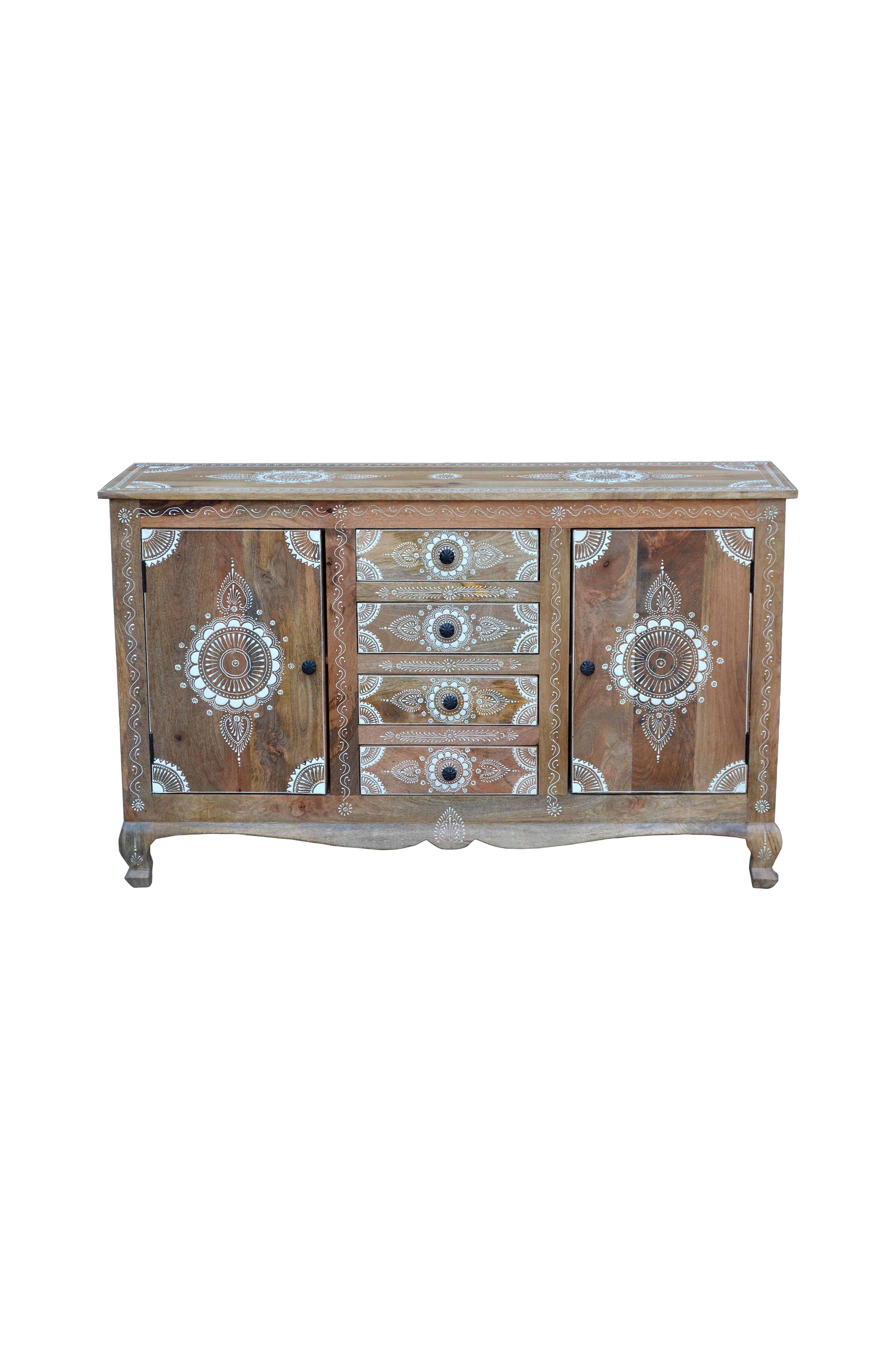 Vi præsenterer den unikke sharma skænk, et fantastisk møbel, der vil tilføje et strejf af elegance til ethvert rum. Skænken er fremstillet af det fineste mangotræ og har en imponerende dekoration på overfladen, som er både indviklet og visuelt tiltalende.