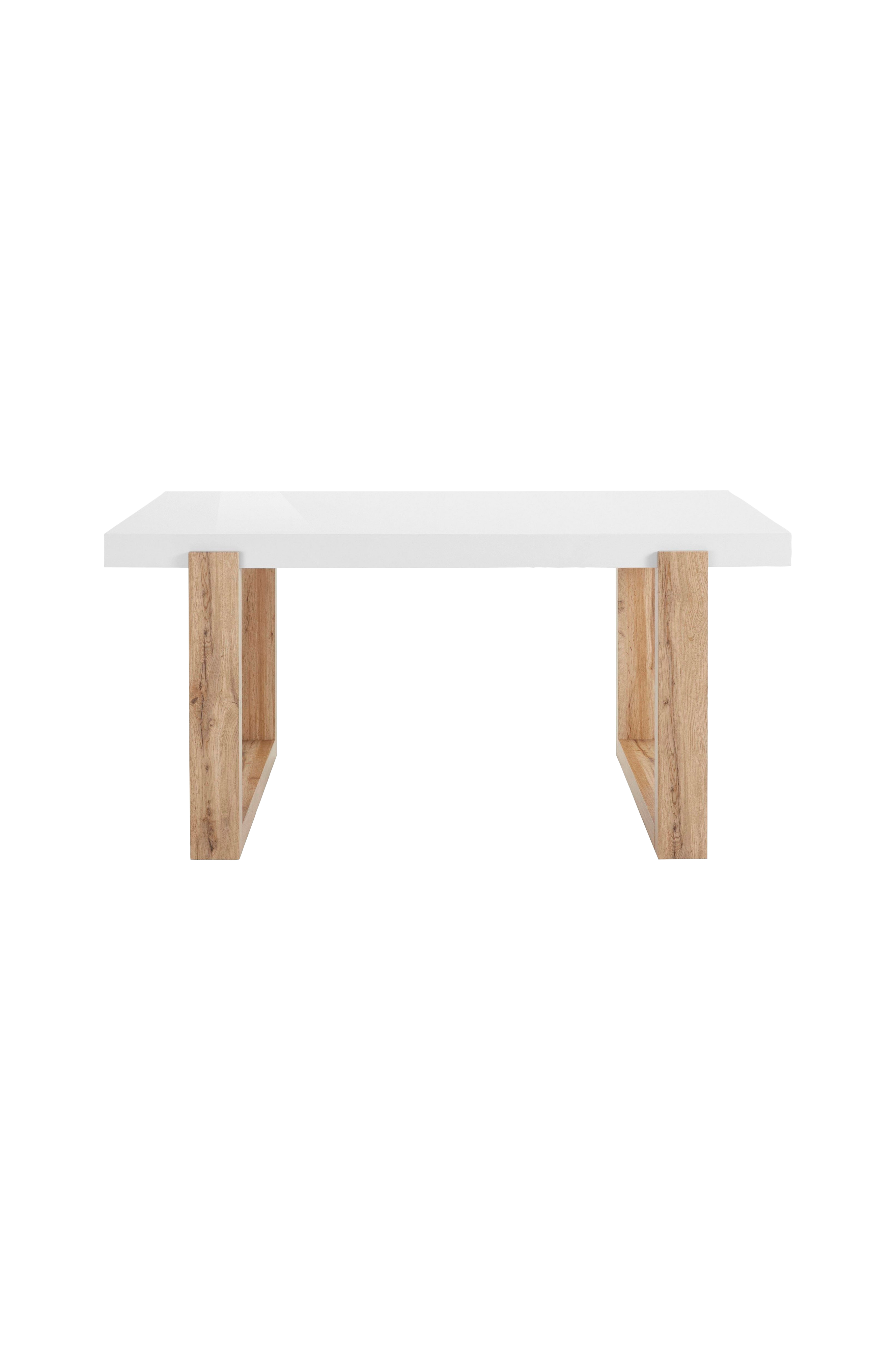 Det vedligeholdelsesvenlige spisebord tiltrækker sig opmærksomhed i ethvert hjem. Bordet har et ekstravagant udseende på grund af kontrasten mellem den højglanspolerede bordplade og stellet med trælook. Da det fås i forskellige bordbredder, passer det harmonisk ind i de enkelte rum. Spisestuemøblerne passer perfekt til moderne stole med udhæng eller læderstole. Om nødvendigt kan spisebordet nemt tørres af med en fugtig klud, hvilket giver en praktisk merværdi i hverdagen. Som materiale er der anvendt et fsc-certificeret træbaseret materiale.