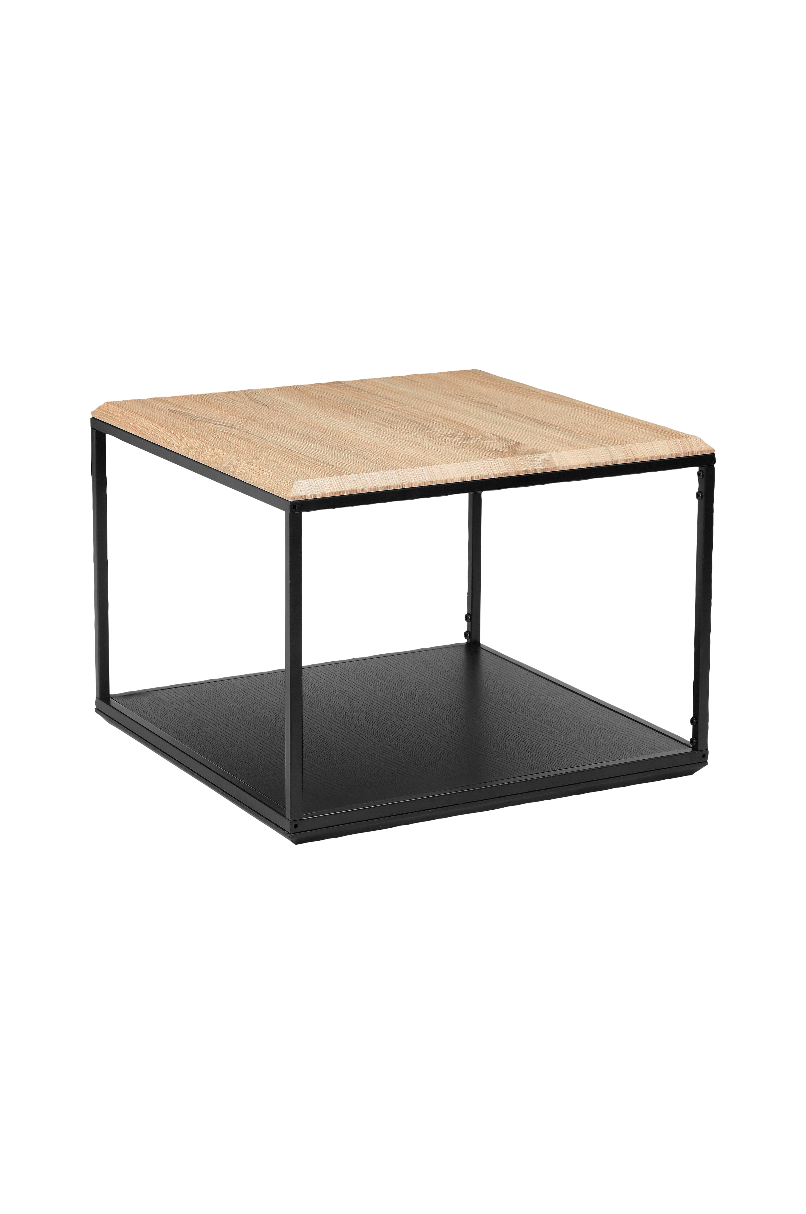 Vi præsenterer et moderne sofabord med et firkantet design. Bordpladen er lavet af spånplade med et egetræslook, der giver et varmt og naturligt udseende. Stelkonstruktionen er lavet af sort metal, hvilket tilføjer et elegant og moderne touch. Dette sofabord er en perfekt blanding af stil og funktionalitet til ethvert opholdsrum.