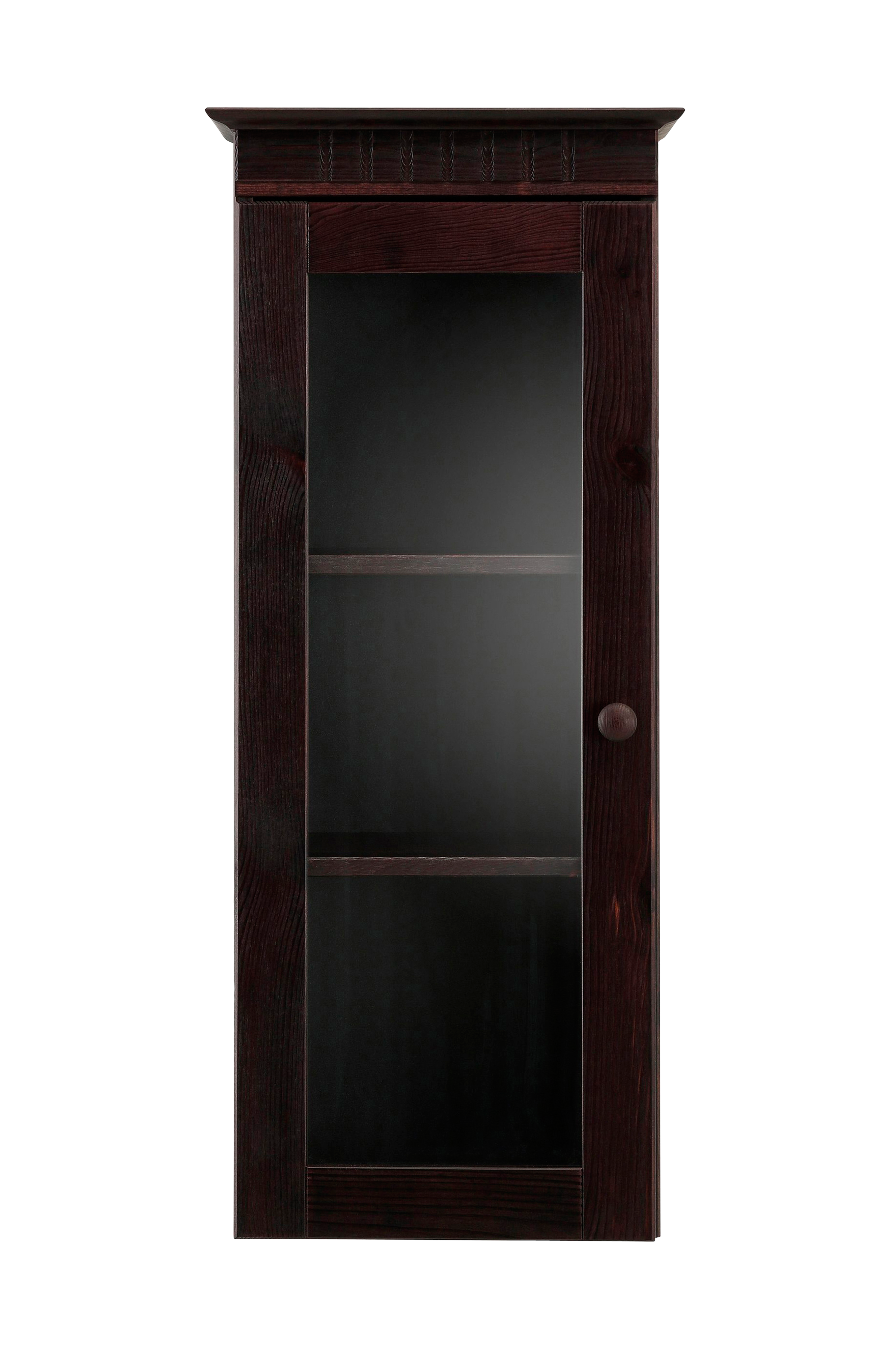 Vægskabet præsenterer sig i en smuk landlig stil. Dekorationen over døren giver stueskabet sin særlige karakter. Det kan udstyres med en glaslåge som en hængende vitrine, hvor glaslågen er ideel til dekorative formål. Bag lågen er der 2 hylder, som kan justeres individuelt i højden efter behov. Materialet består af fsc-certificeret massivt træ. Opgraderer stuen visuelt: vægskabet i en elegant landlig stil. Nem selvmontering med monteringsvejledning.