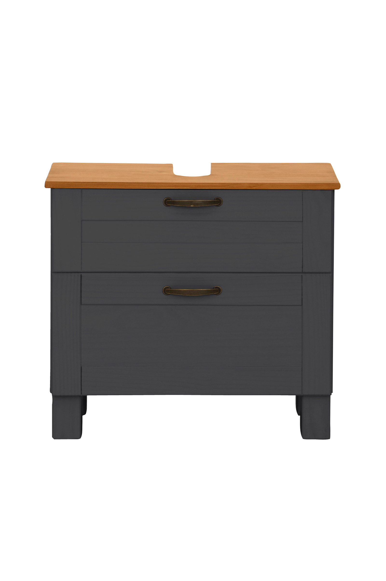 Dette underskab er lavet af massivt træ og skaber ikke kun orden, men også en behagelig naturlig atmosfære i dine fire vægge. Skufferne kan trækkes helt ud og giver dig ekstra opbevaringsmuligheder. Metalhåndtagene er holdbare og tilføjer stil. Dit nye møbel kan belastes med op til 15 kg og fås i flere farvevarianter. Det er slet ikke svært at fremhæve badeværelsesmøblets hyggelige landstil i indretningen: træet passer godt sammen med andre naturlige materialer og sarte farver som creme, beige eller grå. Fund fra loppemarkeder og antikviteter kan for eksempel supplere det rustikke look.