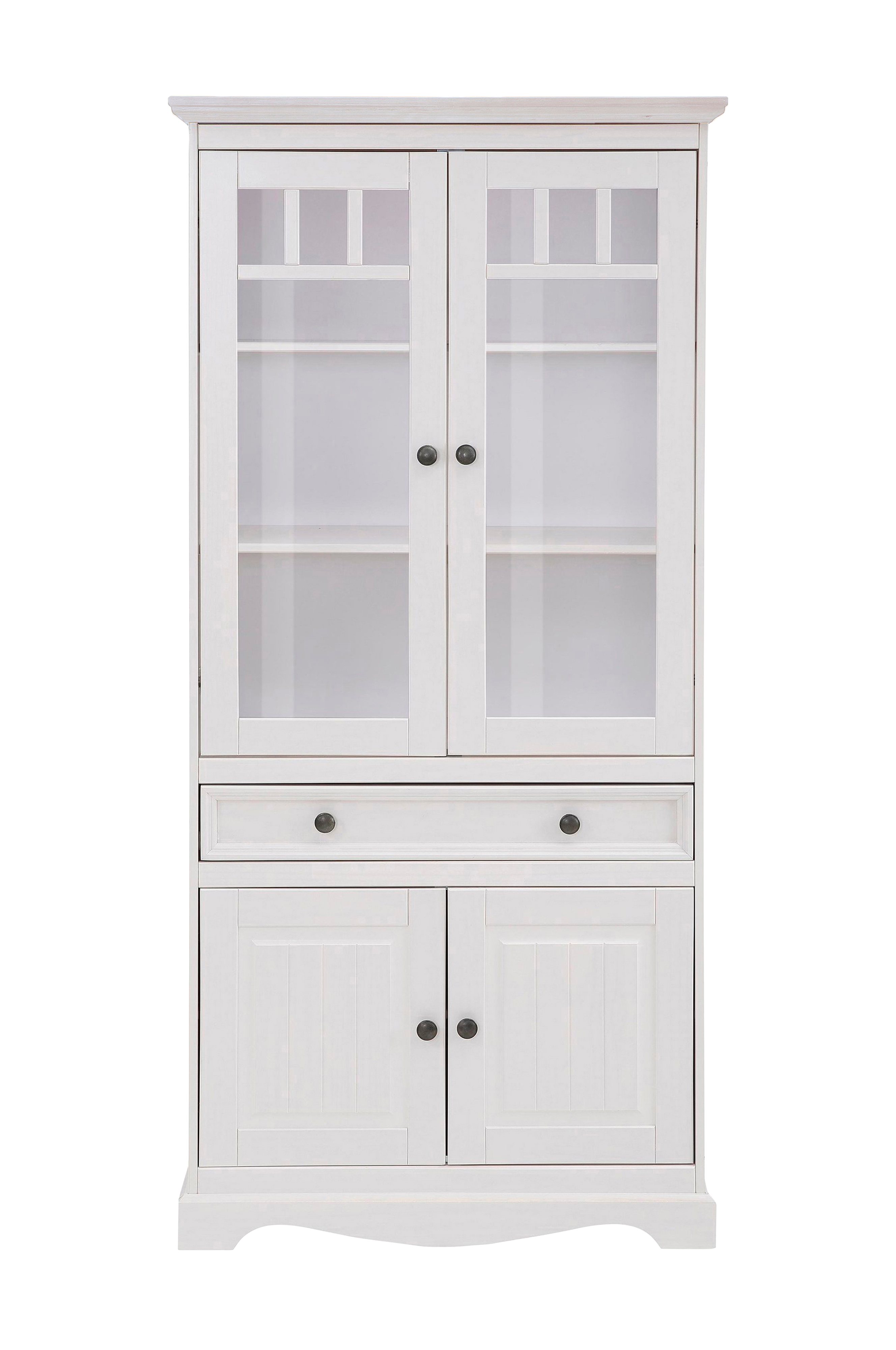 Vitrineskabet inspirerer med sin hyggelige landhusstil. Den er lavet af fsc-certificeret træmateriale og scorer med et trælook, der er nemt at kombinere. De smukke fræsninger og smagfulde detaljer udgør vitrineskabets landlige charme. Håndtagene i metal fuldender helhedsindtrykket. Bag glaslågerne er der masser af plads til glas, vaser eller smukke pyntegenstande på de justerbare hylder. Små ting som bestik kan opbevares i skuffen. Det nederste område er ideelt til porcelæn eller boligtekstiler.