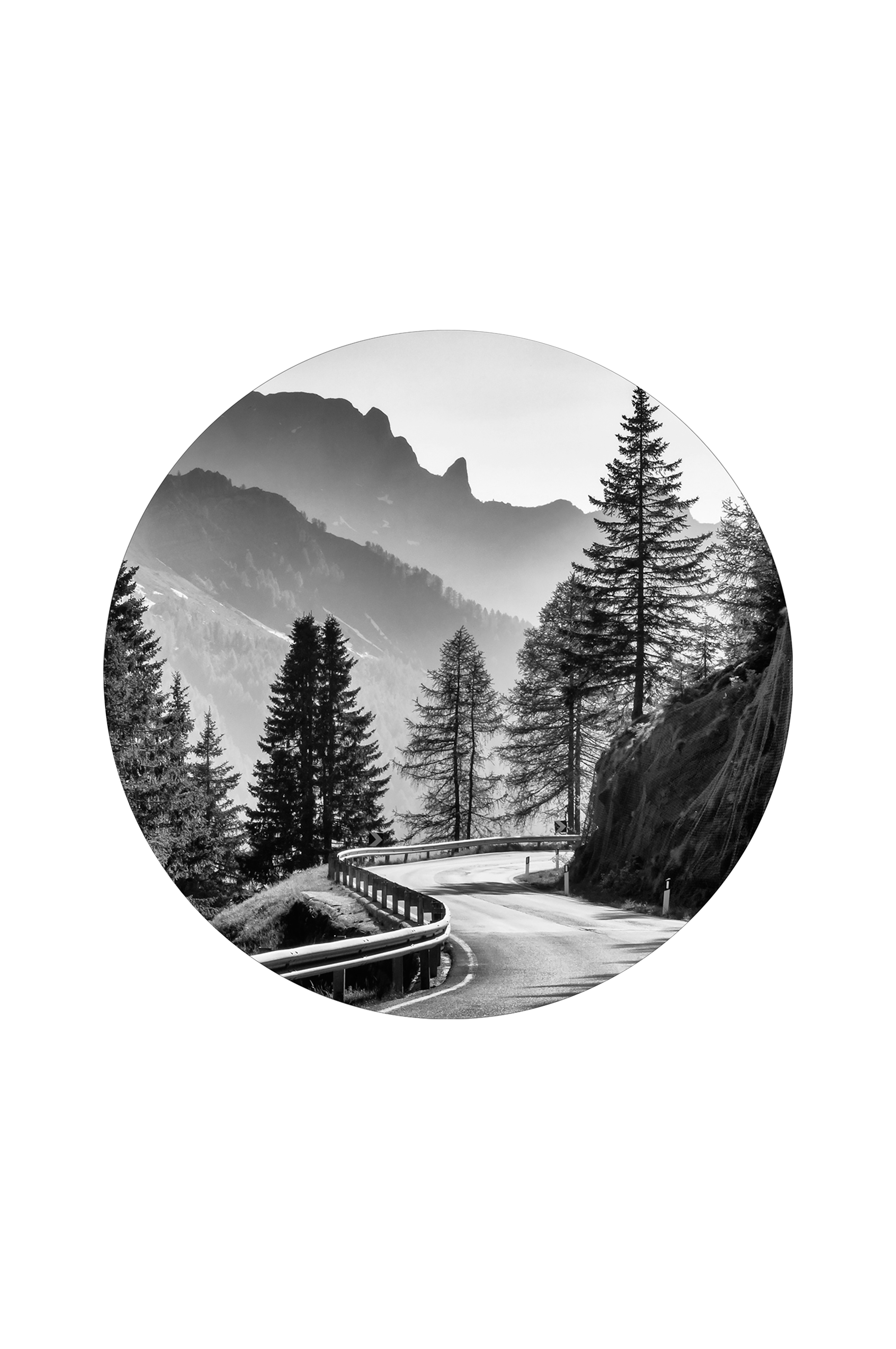Billede Downhill fra Malerifabrikken. Print på rund MDF-plade. Når billedet er hængt op, gør profilen på pladen at fronten "svæver" ca. 0,5 cm fra væggen.