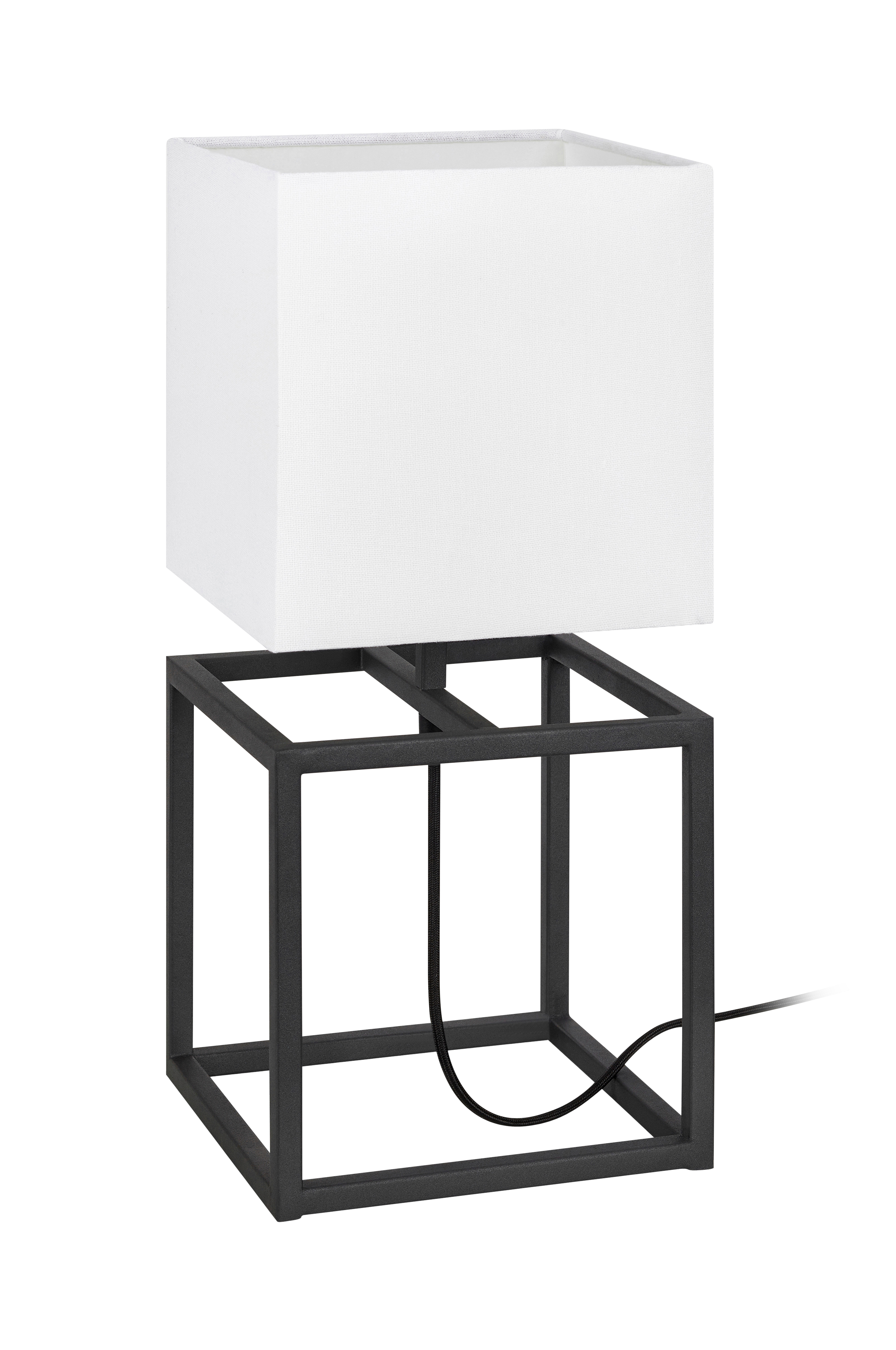 Cube bordlampe fra Markslöjd. Fod i metal og tekstilskærm. 2 m sort ledning med afbryder på ledningen. Stor fatning (E27). Højde 45 cm, bredde 20 cm, dybde 20 cm. Maks. 60 W glødepære eller tilsvarende styrke i halogen, lavenergi eller LED. Pære medfølger ikke.