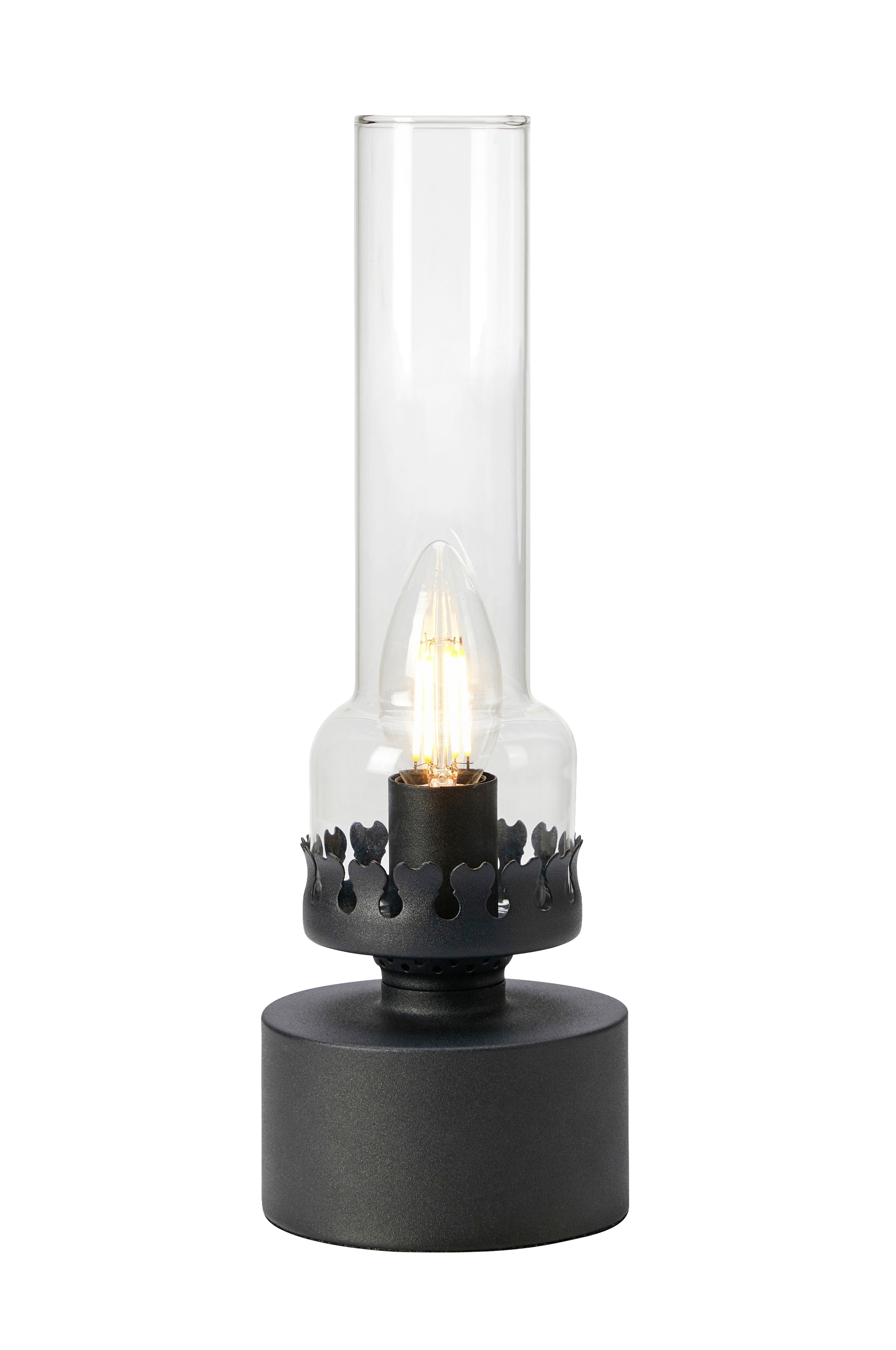 Kandella bordlampe fra markslöjd. Fod i metal og skærm i klart glas. 2 m transparent pvc-ledning med afbryder på ledningen og vægstik. 1xe14, maks. 40w. Lyskilde ikke inkluderet.
