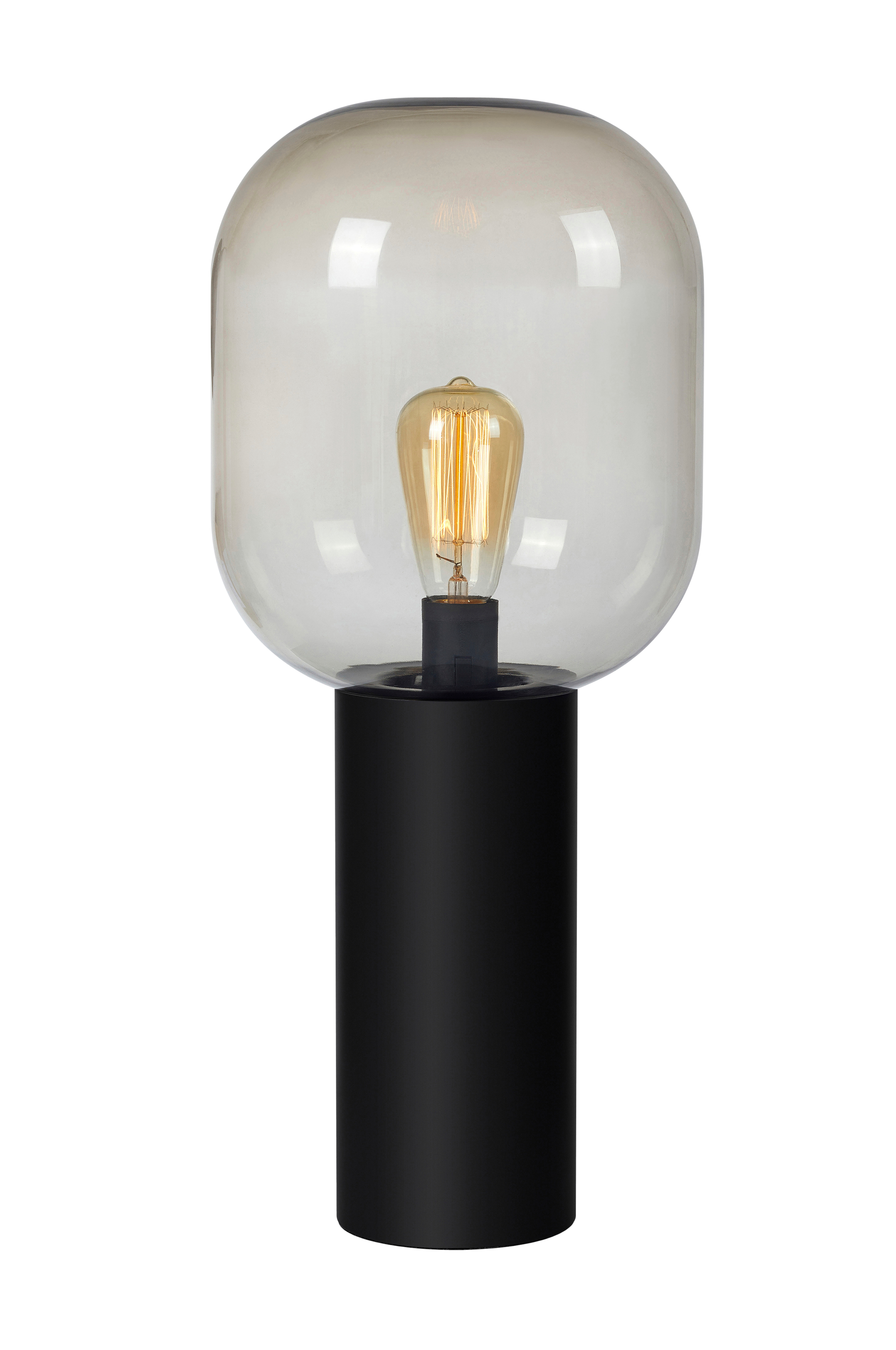 Bordlampe med sort metalfod og stor, røgfarvet glaskuppel, som spreder et herligt lys i dit hjem. En moderne bordlampe som tager plads! Sort stofledning, ledningslængde 2 meter.