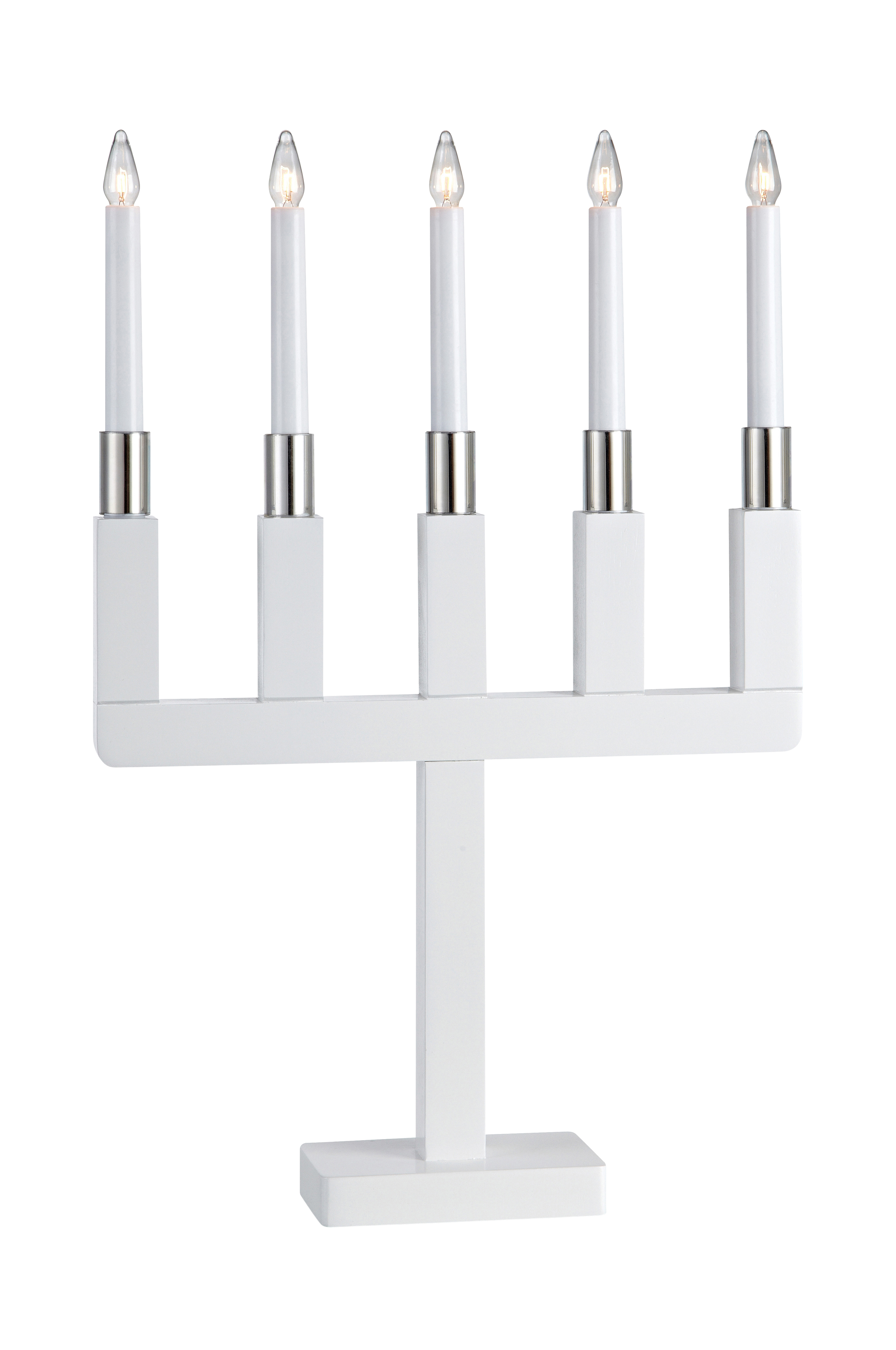 Sundstorp trælysestage fra Markslöjd Collection. Manchetter i sølv. Fatning 5 x E10 maks. 3 W. 2 meter ledning med strømafbryder og vægkontakt. Bredde 35, dybde 8 og højde 53 cm.