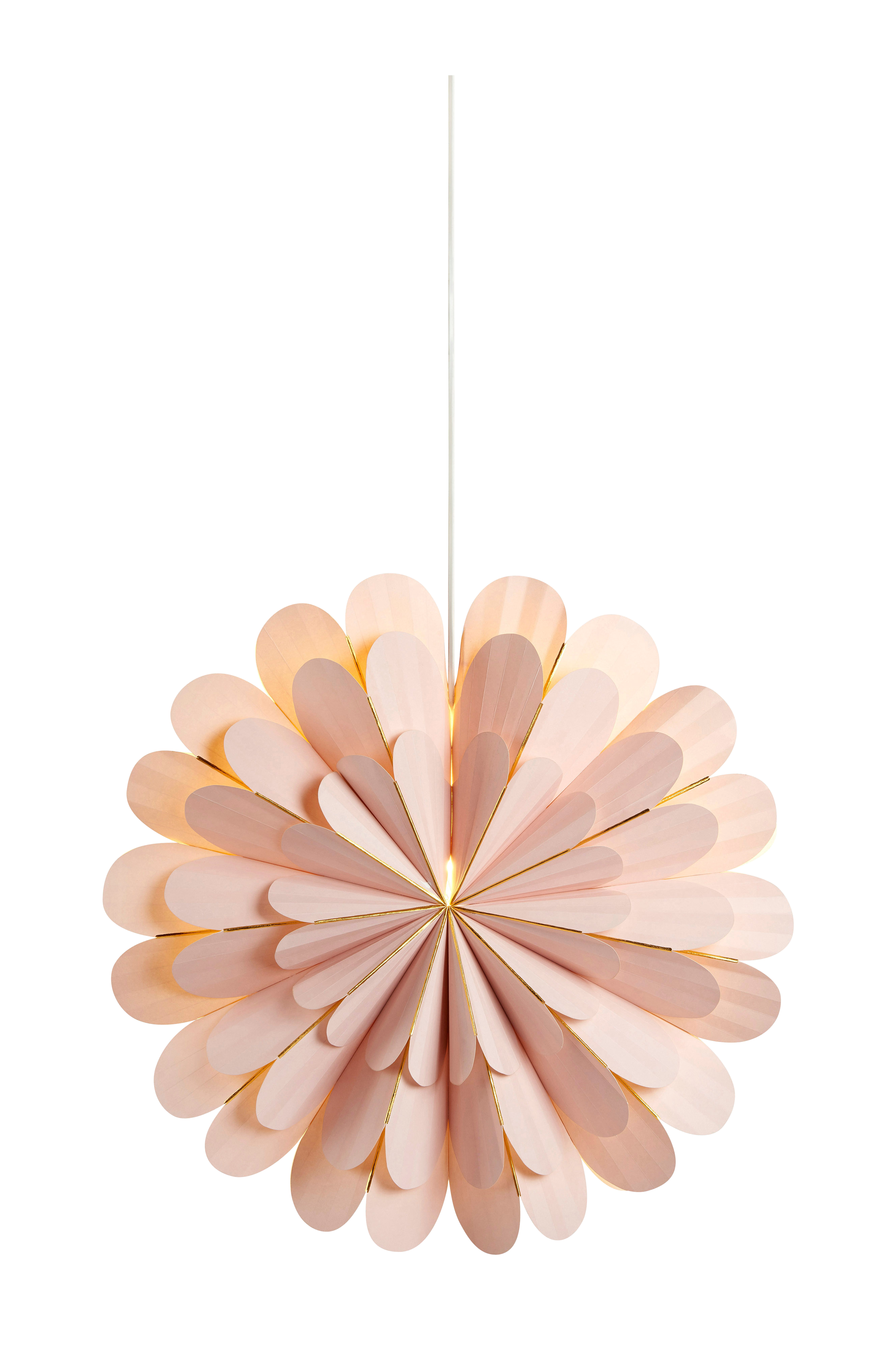 Pendel med skærm i papir i blomsterfacon. Diameter 60 cm og dybde 18 cm. Det foldede papir giver et smukt lysskær. Lyskilden skal have lille sokkel (E14) på maks. 25 W eller tilsvarende i LED, medfølger ikke. 3,5 meter lang ledning med afbryder.