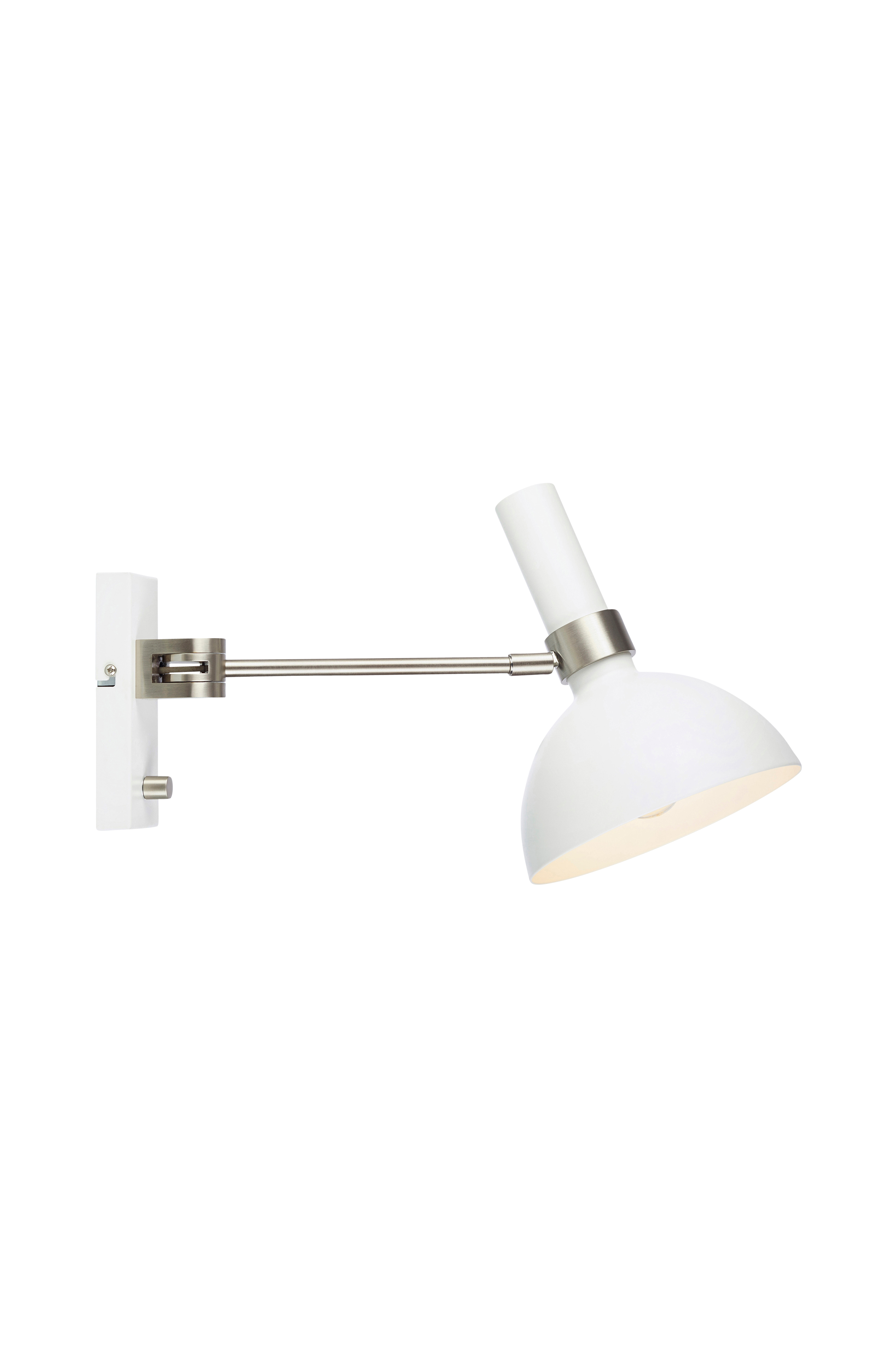 Væglampe i hvid metal med arm i stål. Drejearm og skærm. 2 m hvid ledning med dæmper på vægpladen. Maks. 1x60 W. E27-fatning. 40 cm arm, højde 19 cm og dybde 24 cm.