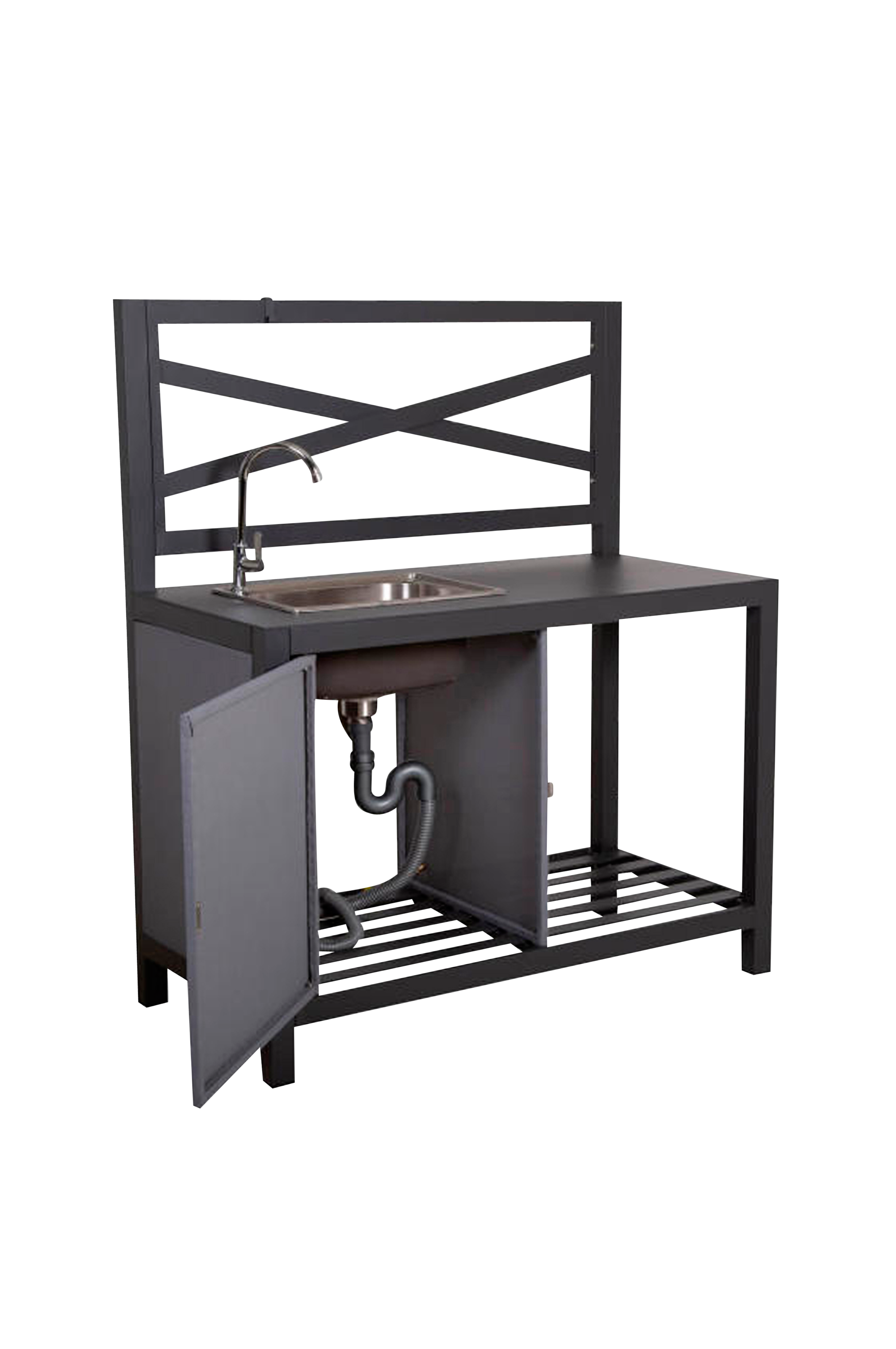Udendørs køkkenbord med håndvask. Fremstillet med en pulverlakeret aluminiumsramme og en pulverlakeret aluminiumsplade. Vasken er lavet af rustfrit stål. Vægge og en låge i textilen skjuler undersiden af vasken. Med en adapter til at tilslutte haveslangen til vasken. Med plads til opbevaring nedenunder.