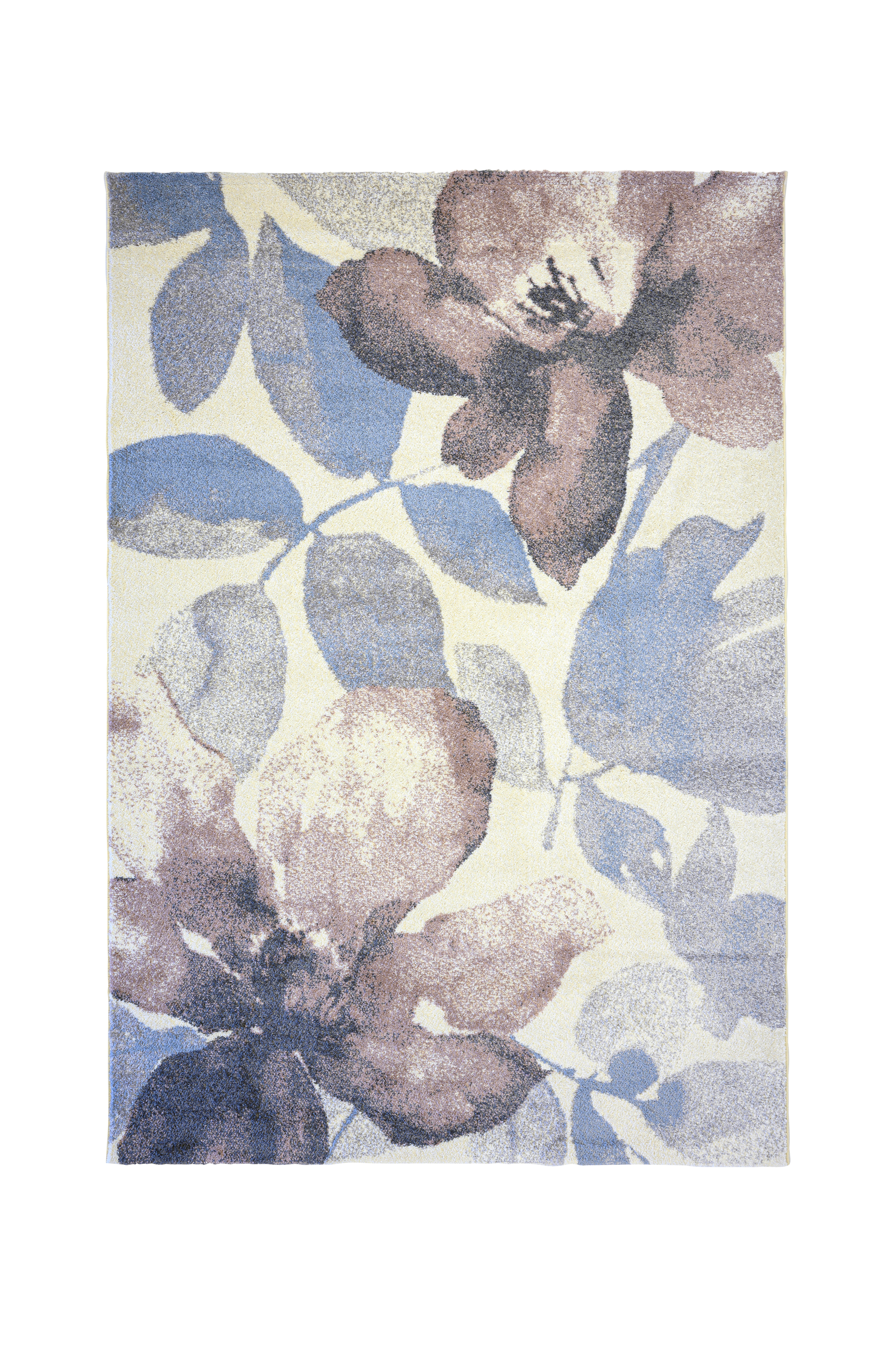 Smukt maskinvævet tæppe med mønster af blomster.
