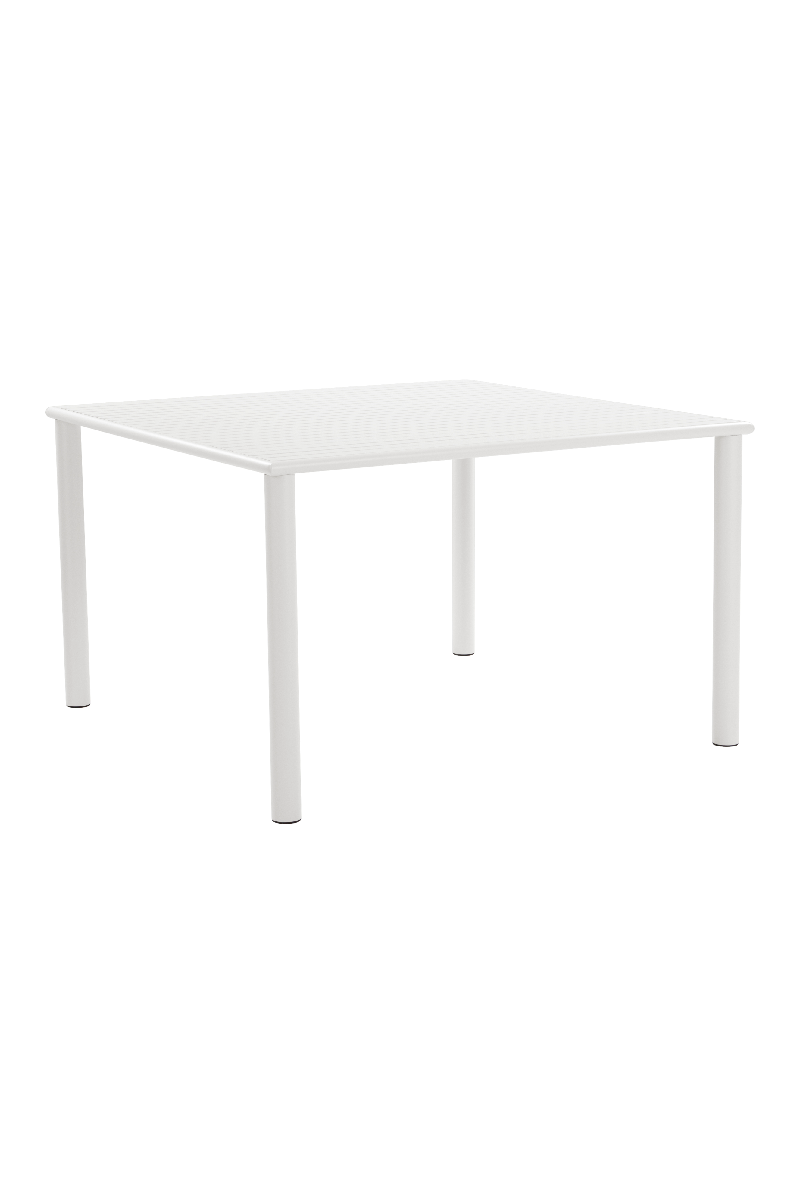 Sofabord af pulverlakeret aluminium med mat overflade, som ikke blænder i solskin. Det er skønt at flytte ud på altanen eller terrassen, når varmen kommer. MENTON kan holde til at stå udendørs, og det gør udelivet lettere. Du behøver ikke at bære det hver gang du vil sidde udenfor. Aluminium er rustfrit hvilket er praktisk til havemøbler. Møblet er flot og den praktiske størrelse gør bordet nemt at placere. Lav vægt.