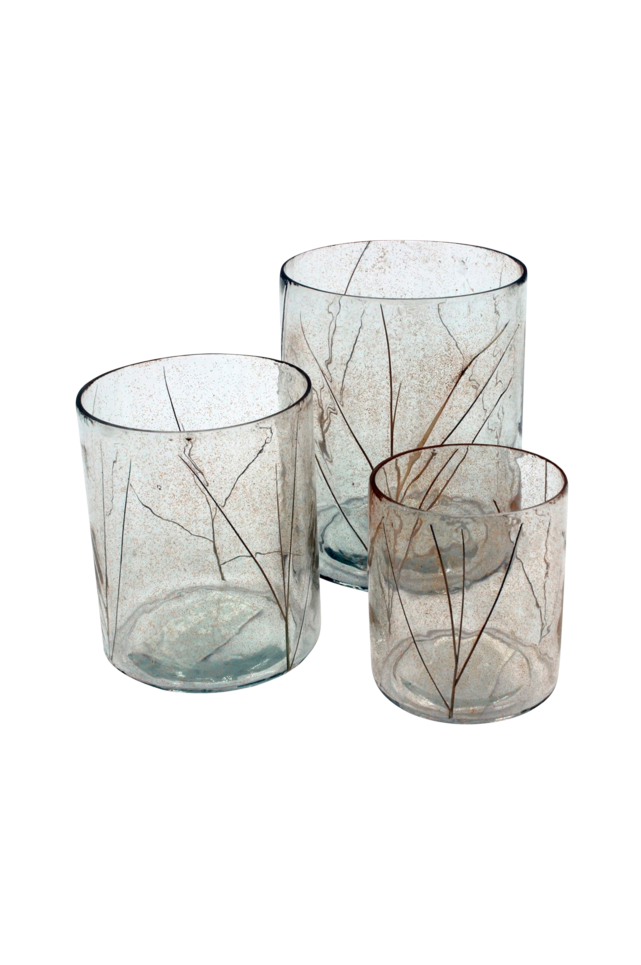 Lysestager i glas med en fin dekoration og gyldent skær. Lille stage D7 cm x H8 cm, mellem D8 cm x H10 cm og stor D10 cm x H12 cm.