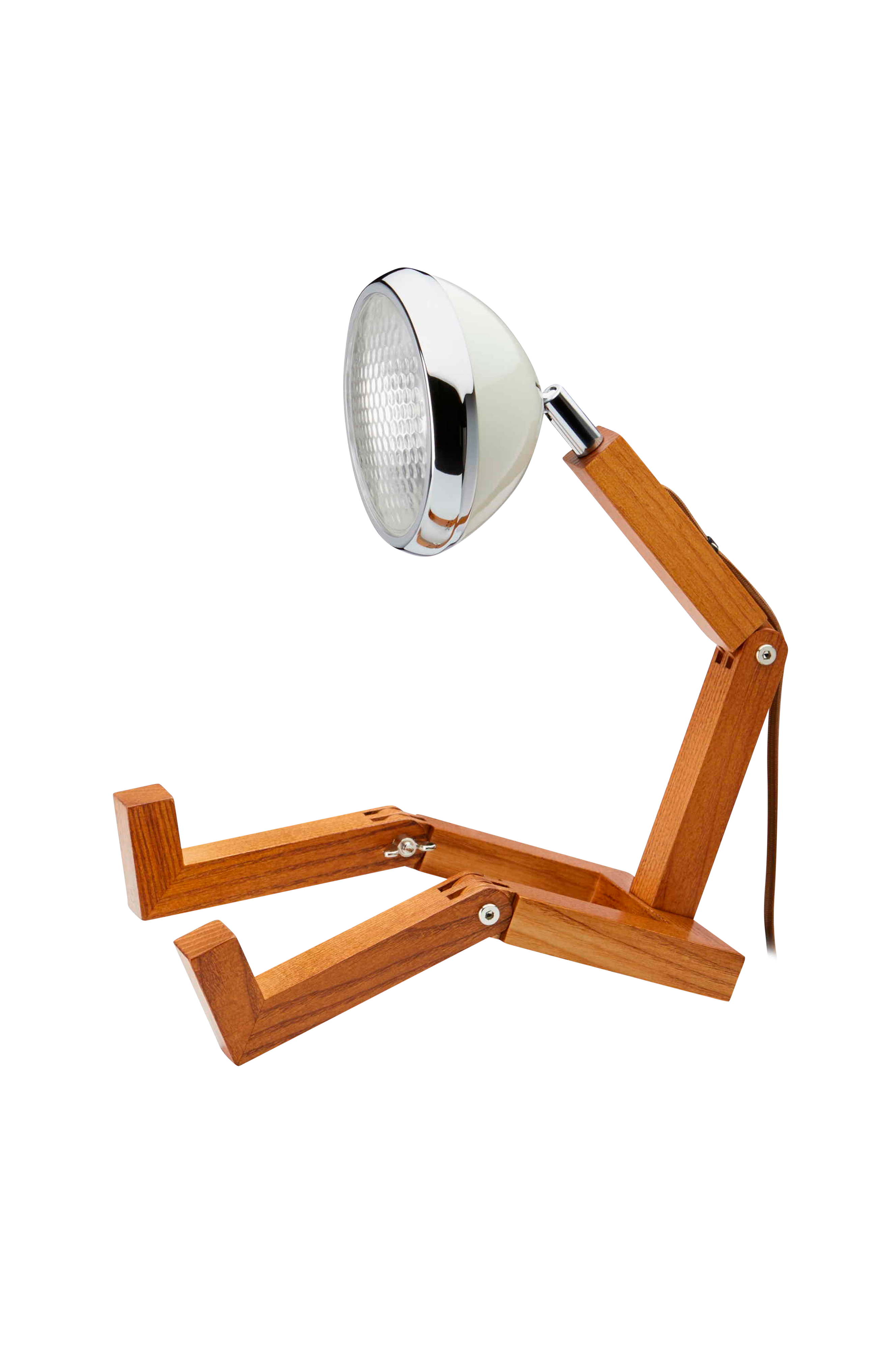 Bordlampe med et design inspireret af den ikoniske Vespa og legetøjsfigurer fra 70'erne. Lampen er håndlavet i smukt asketræ. Den kraftige LED-pære lyser godt og de 139 glasbobler på forlygten skaber en behagelig atmosfære. Lampen kan vælte, hvis den placeres i oprejst position. Lampen er designet til at være i siddende position. Til stående position er der brug for en lampestander fra Piffany Copenhagen. Mål: B 15,5 cm, D 27,6 cm, H 18-40 cm inkl. 2,3 m lang stofledning (brun), samt en 12V G4 LED-glødepære (2,5W). Adapter til EU- og UK-stik medfølger. Lumen 200 lm. Input voltage 100V-240V AC. Color temperature 2700 k. Color rendering(ra) >80 life expactancy 25.000 hr Materiale: Asketræ/aluminium/metal