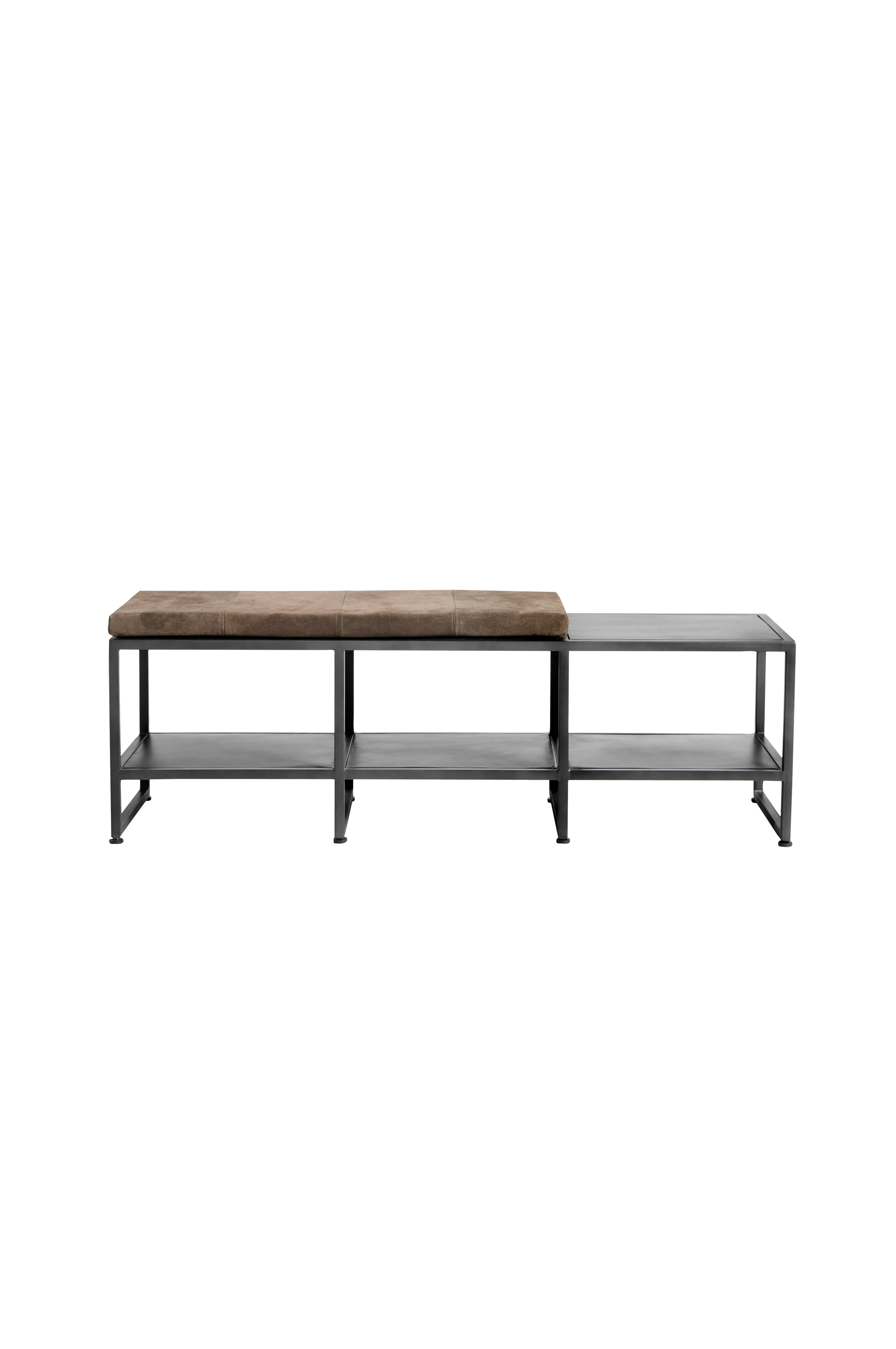 Bænk med hylde fra muubs. Bænken bronx i størrelse l er designet i en kombination af materialerne ruskind og jern. Under bænken er der en praktisk opbevaringshylde, og der medfølger en ruskindshynde, som dækker ca. 2/3 af bænken.