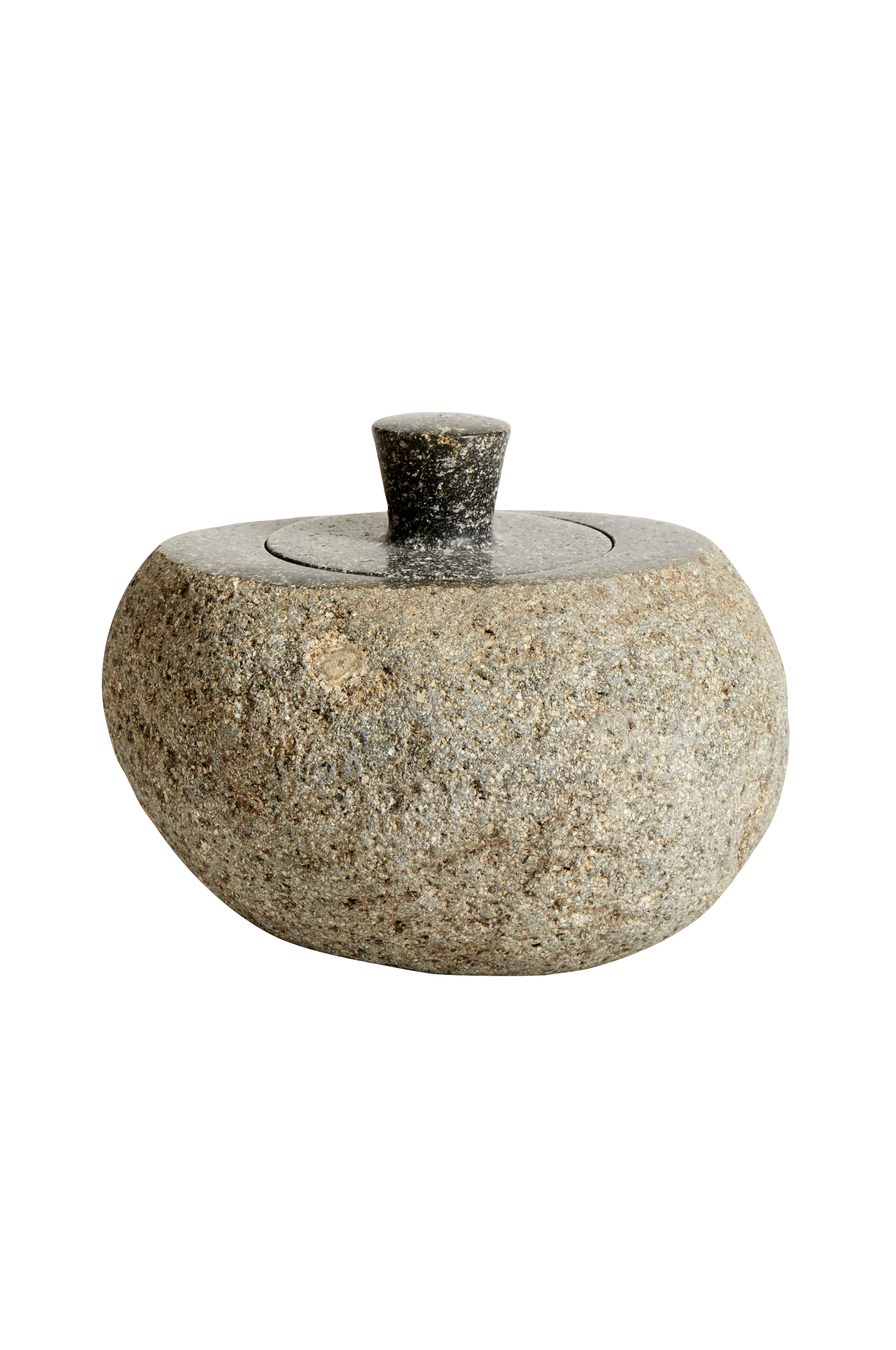 Krukken Valley med låg er enkelt men iøjnefaldende tilbehør til køkkenindretningen. Den er lavet af natursten med en poleret inderside og en rå yderside - krukken kan derfor variere i form, farve og størrelse. Du får en unik krukke til at servere eller opbevare små snacks eller f.eks. tapenade i. Kan nemt opbevares i køleskabet eller et andet sted med det praktiske låg ovenpå. Godkendt til fødevarer.