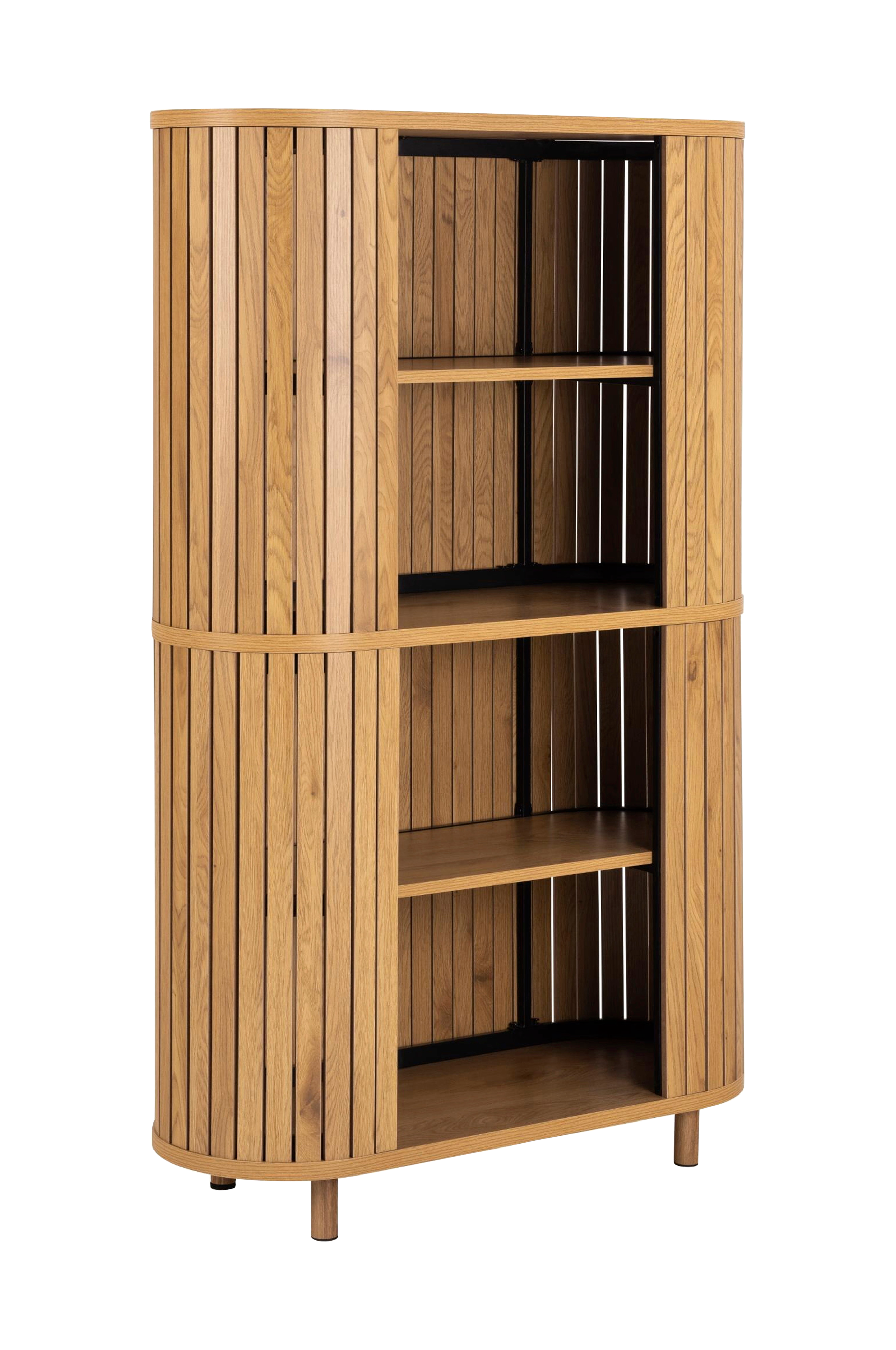 Et samspil mellem lys og skygge i denne delvist åbne reol tiltrækker opmærksomhed til dens lameldesign. Reolen tilføjer visuel lethed til rummet og forbedrer ikke kun den æstetiske appel i rummet, men giver også et hjem til bøger og små dekorationer på sine 3 hylder. Med sit vilde egetræslook tilfører den ubesværet rummet en varm atmosfære.