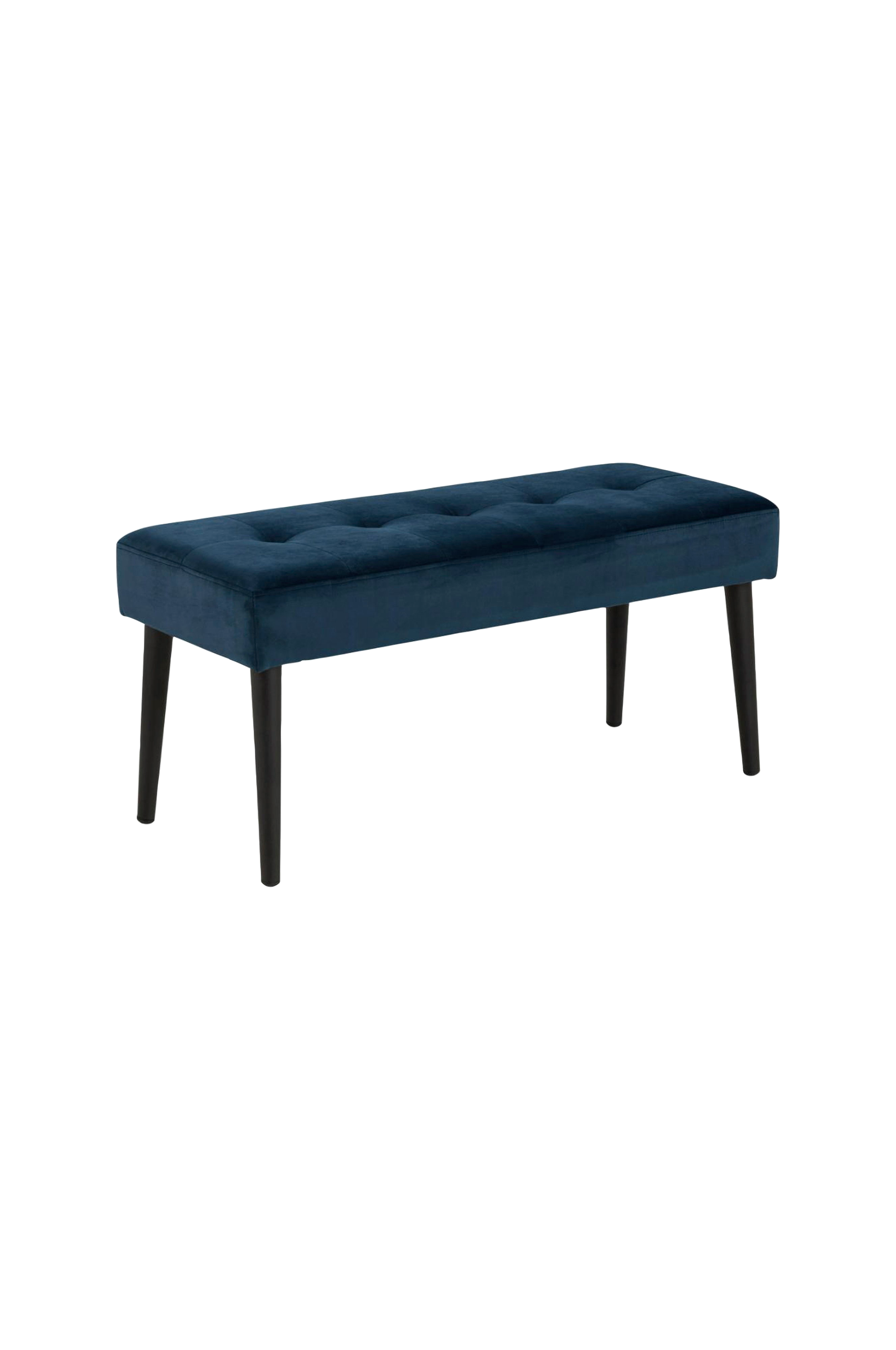 Glory bænk, vic stof navy blue 66, base mat sort ru pulverlakeret stål, med tufting, 95x38x45 cm - en moderne bænk med en underspillet elegance, der giver et ubesværet look til din gang, stue eller soveværelse. Tuftingdetaljerne giver sædet struktur og en ekstra luksuriøs fornemmelse. Det smukke marineblå fløjlsstof har en karakteristisk blød fornemmelse og skaber dybde i møblet. Denne bænk vil helt sikkert gøre indtryk i dit hjem.