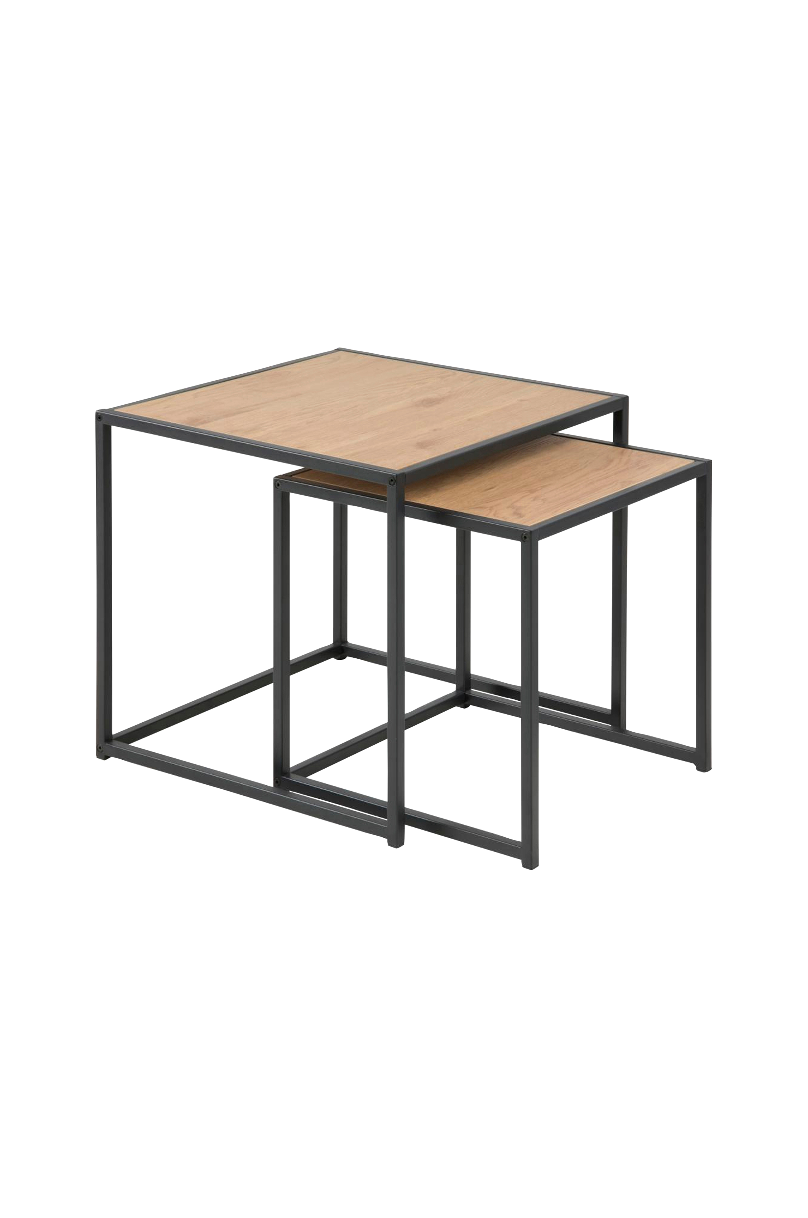 Indskudsbordet er fremstillet af omhyggeligt udvalgte materialer som er praktiske. Med eksklusive designrettigheder er disse indskudsborde den perfekte detalje som giver rummet en flot stil. Møblet har en slående træeffekt og pulverlakeret metalstel. Folieret MDF. Mål: Stort bord 50x50, højde 45 cm. Lille bord 40x40, højde 40 cm.