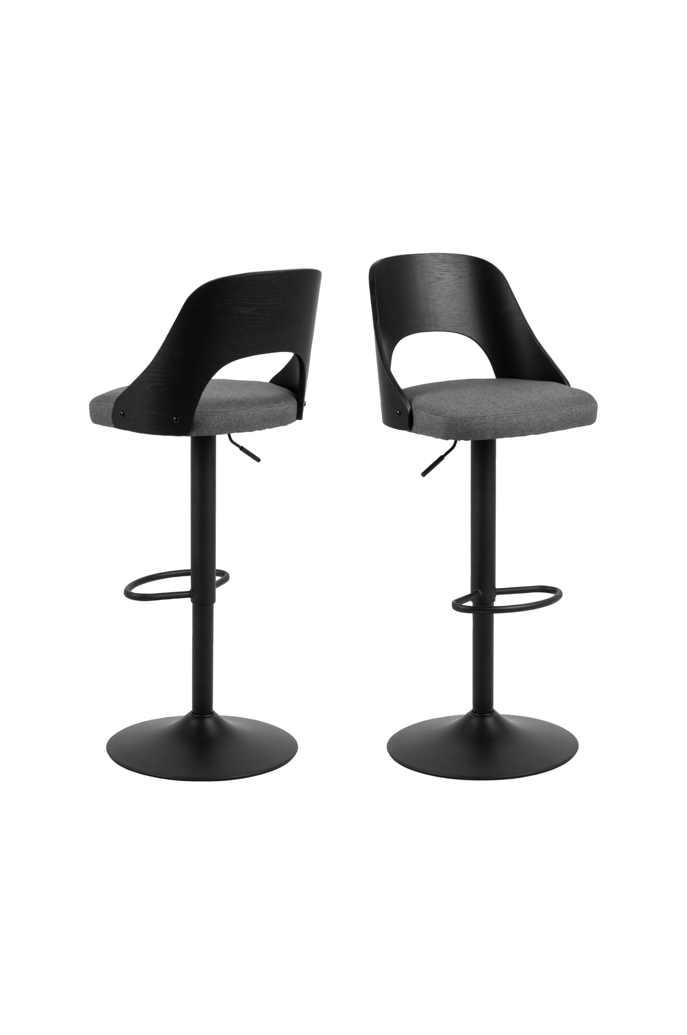 Lucy barstol, malmø stof mørkegrå 95 og sortbejdset wb lakeret egefinér, trompetfod matsort ru pulverlakeret stål, med gaslift og drejning, kasse 2 stk - denne barstol viser, hvordan man kan forene en moderne følelse med klassisk skandinavisk æstetik. Se bare den afrundede ryg i lakeret sortbejdset egefiner med åben ryg og mørkegrå sædepude - skønheden ligger i detaljerne. Den står på en sort trompetfod og har en drejefunktion, der gør det lettere at bevæge sig og giver øget komfort.