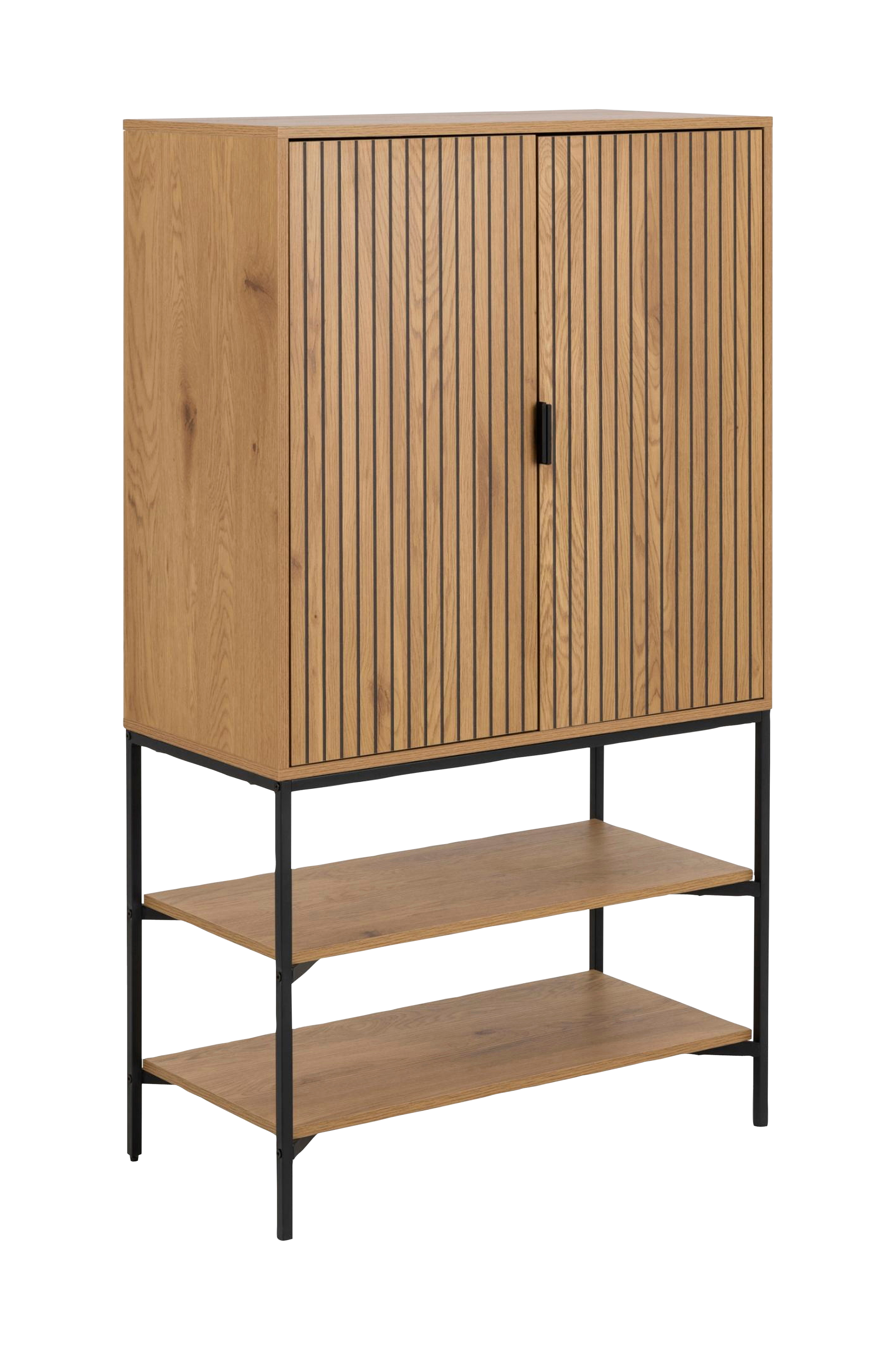 Med en slank, minimalistisk stil er det mere end blot et sted for dine småting - det sætter tonen for hjemmet. Se bare på lamelfronterne med elegante håndtag lavet af samme robuste, pulverlakerede metal som stellet. Skabet har justerbare hylder, så det passer til dine behov.