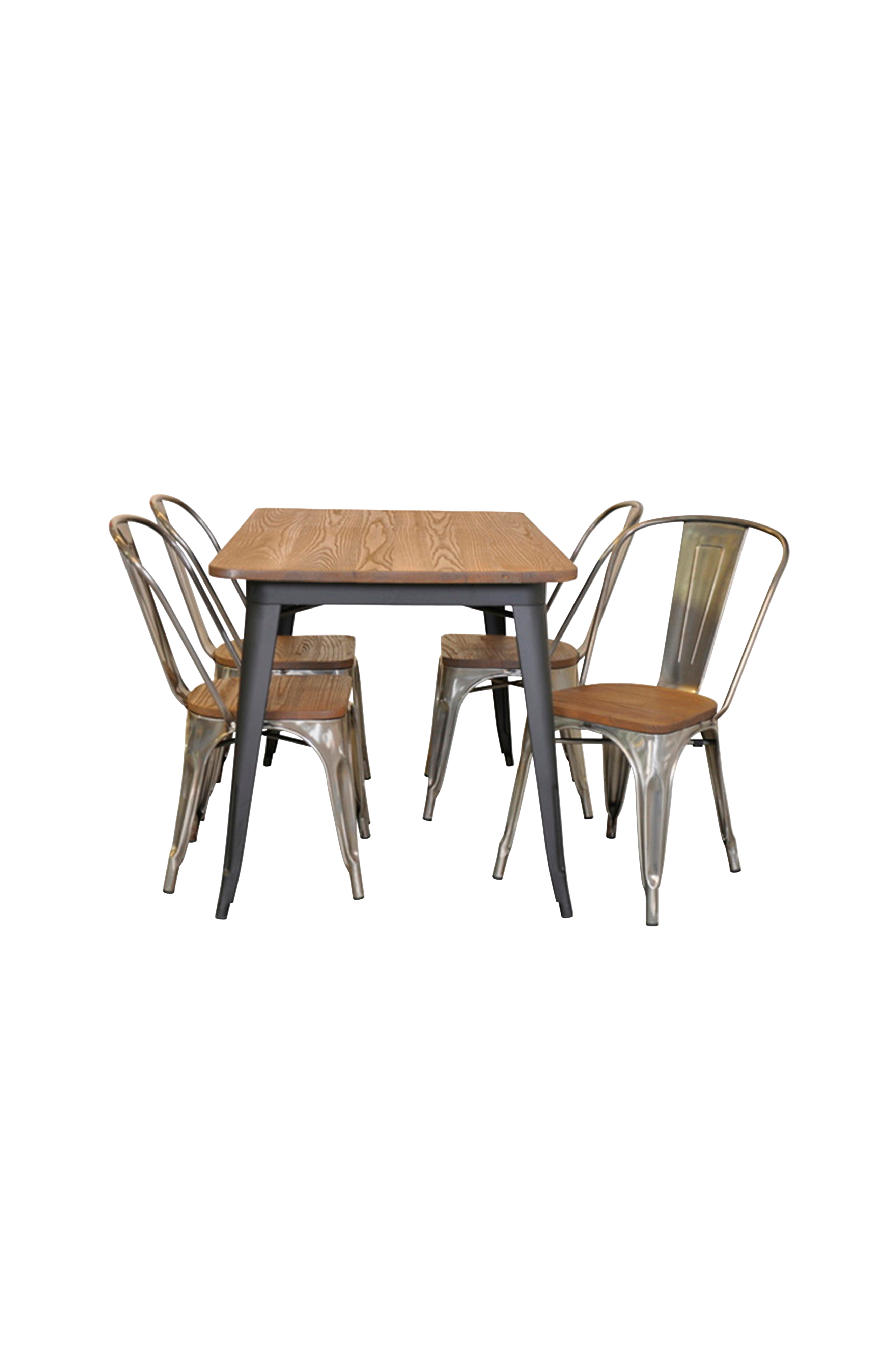 Dette franskinspirerede sæt består af et bord med en plade i rustik, rå farve. Der medfølger 4 metalstole.