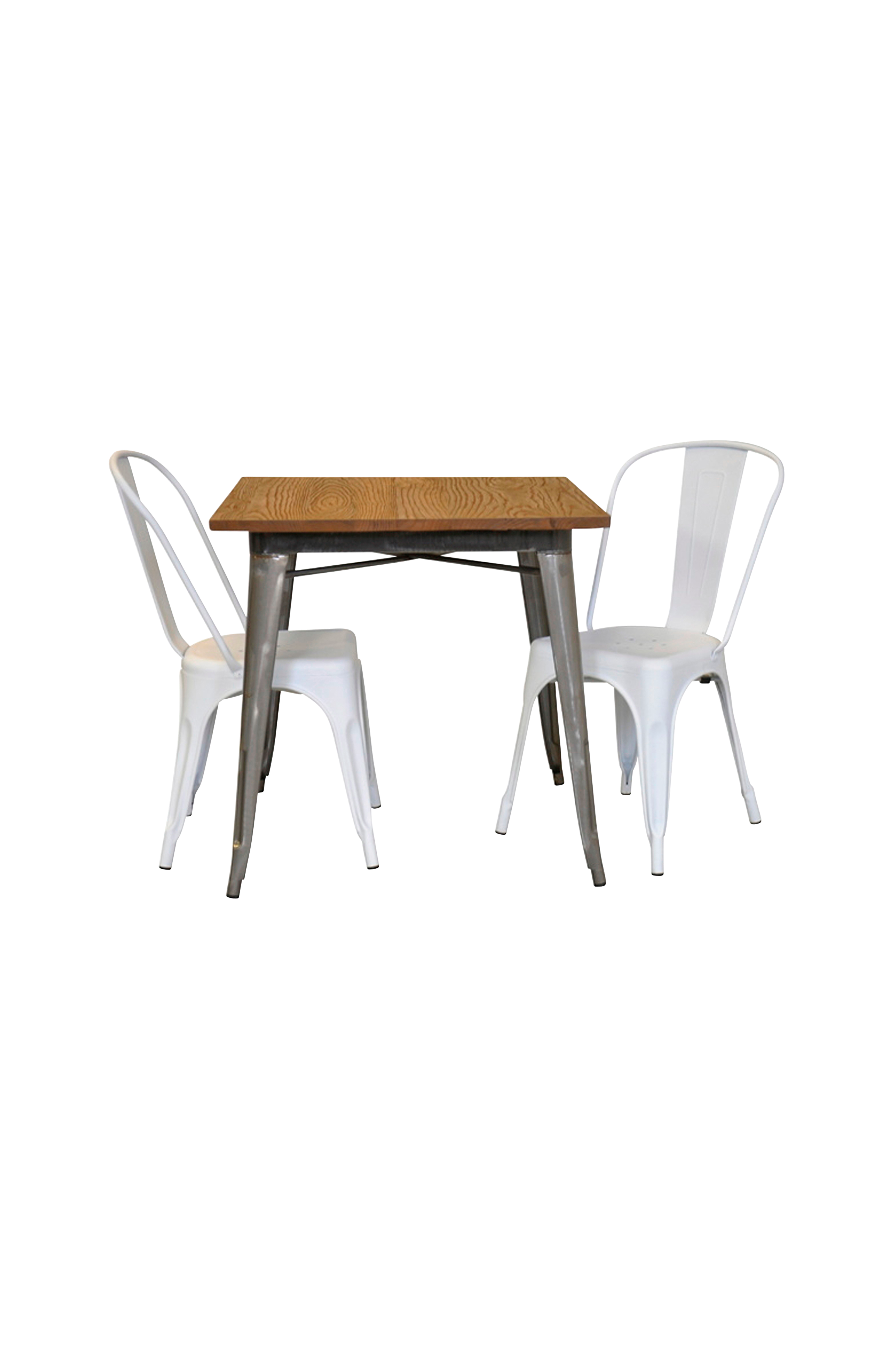 Dette franskinspirerede sæt består af et bord i galvaniseret metalplade med en plade i rustik. Der medfølger 2 metalstole.