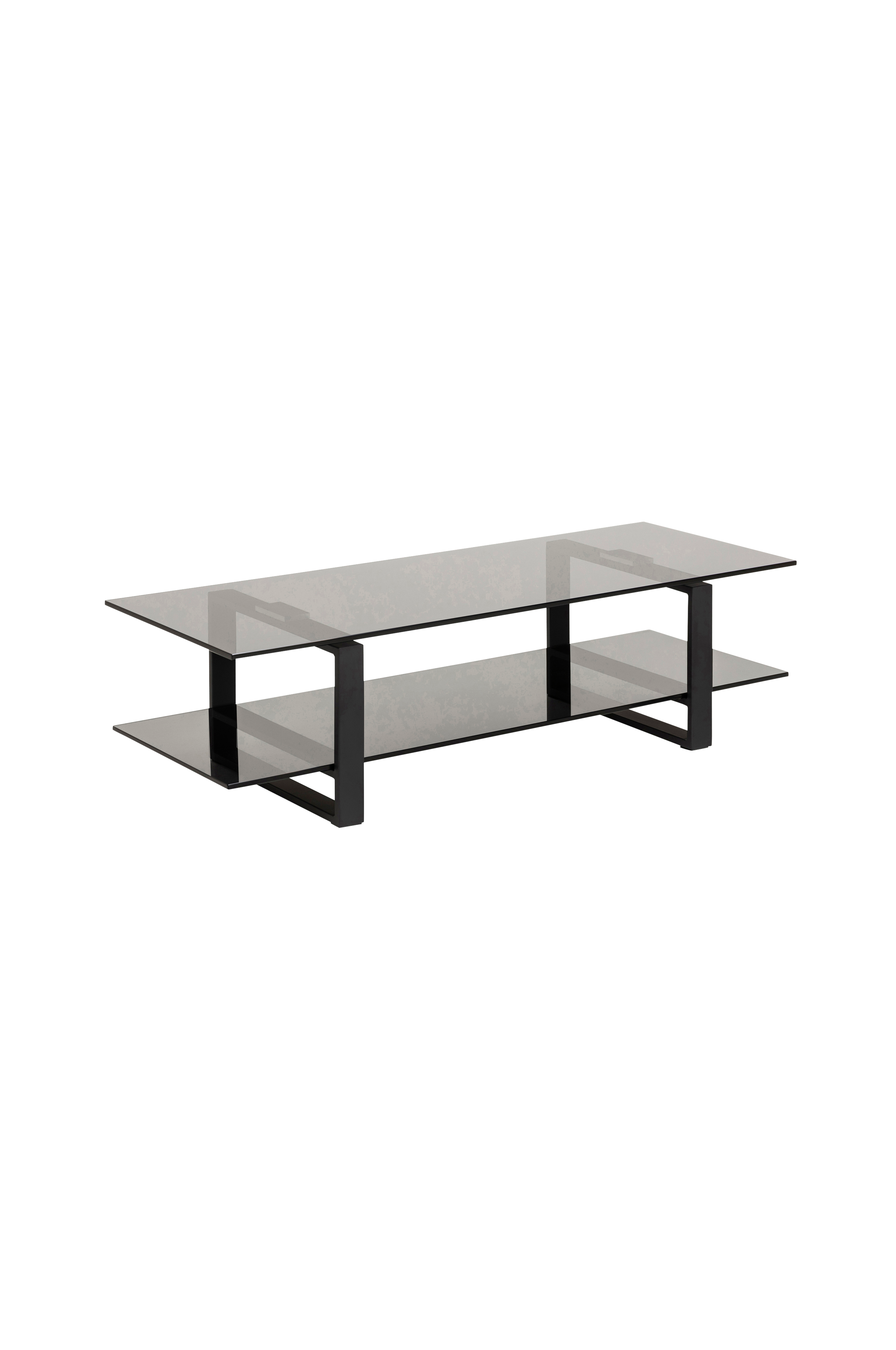Tv-bænk Niki. Metalstel og røgfarvet glas. Mål: glas 10 mm. Længde 120, dybde 45, højde 32 cm. Leveres usamlet.