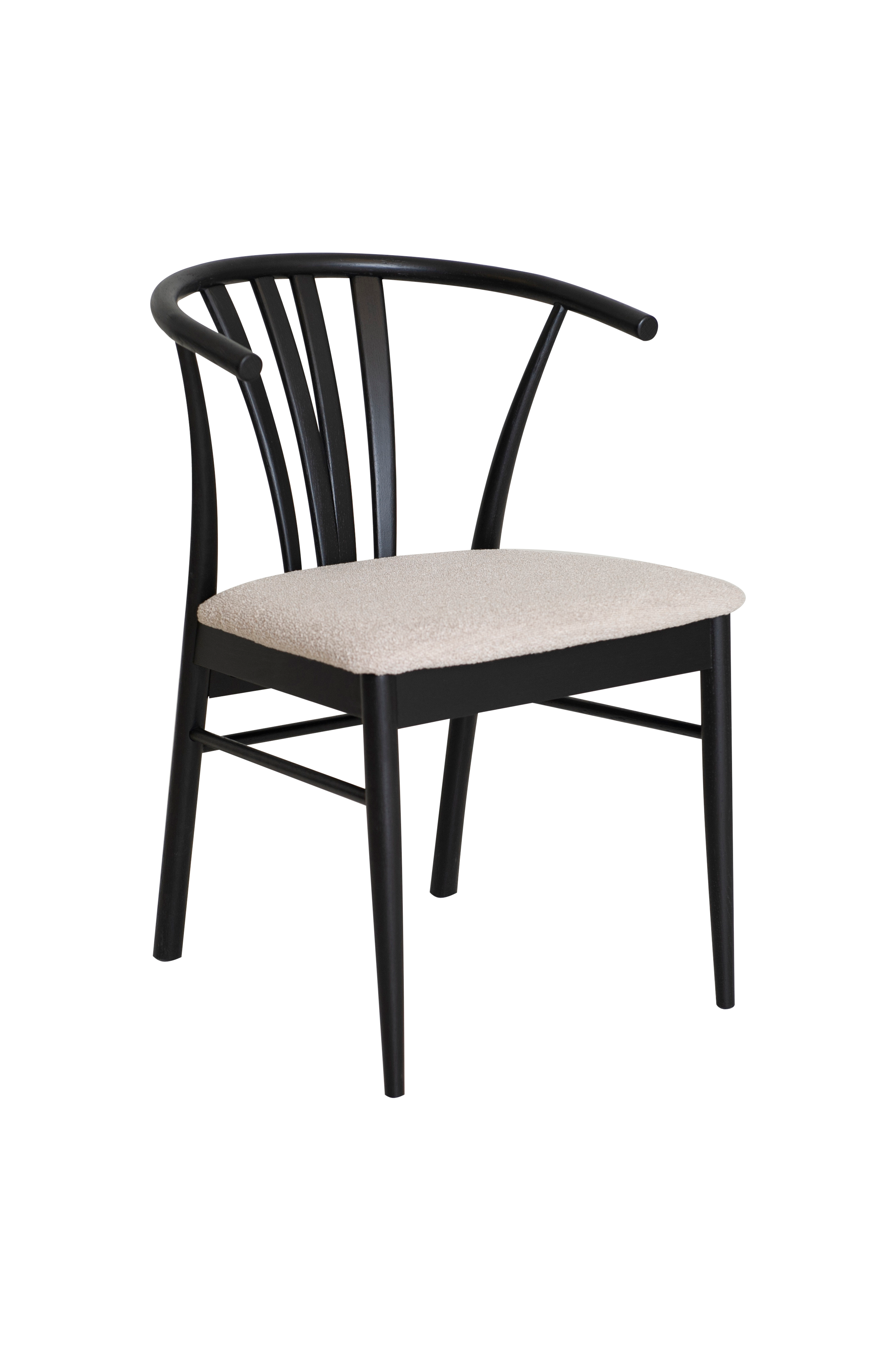 Stolen har et elegant design med afrundet ryg, som giver en god siddekomfort. Sædet er i boucle-stof. Pakket 2 stk. i en kasse. Varen er samlet.