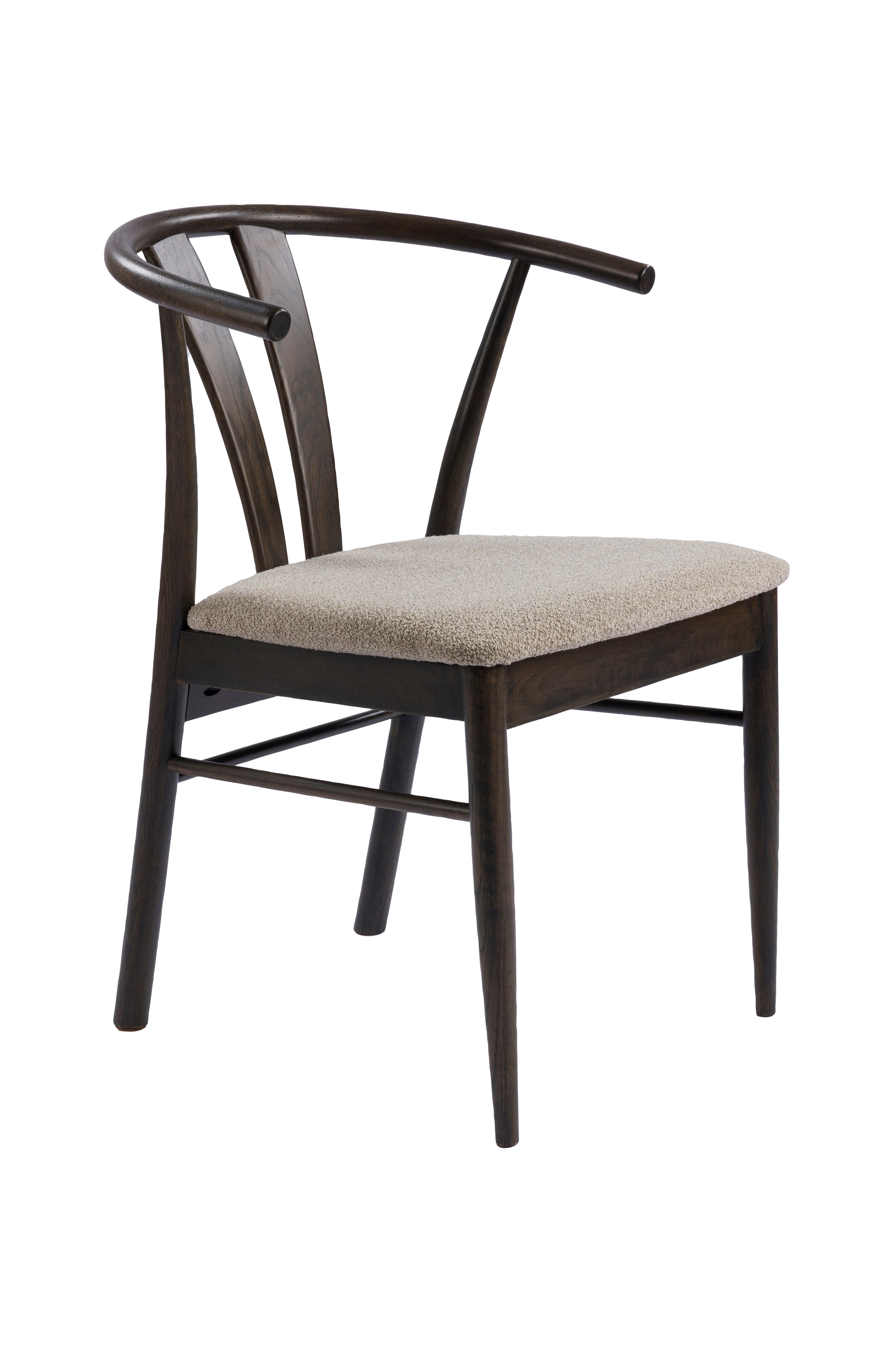 Stilren stol i lakeret eg og stofsæde.