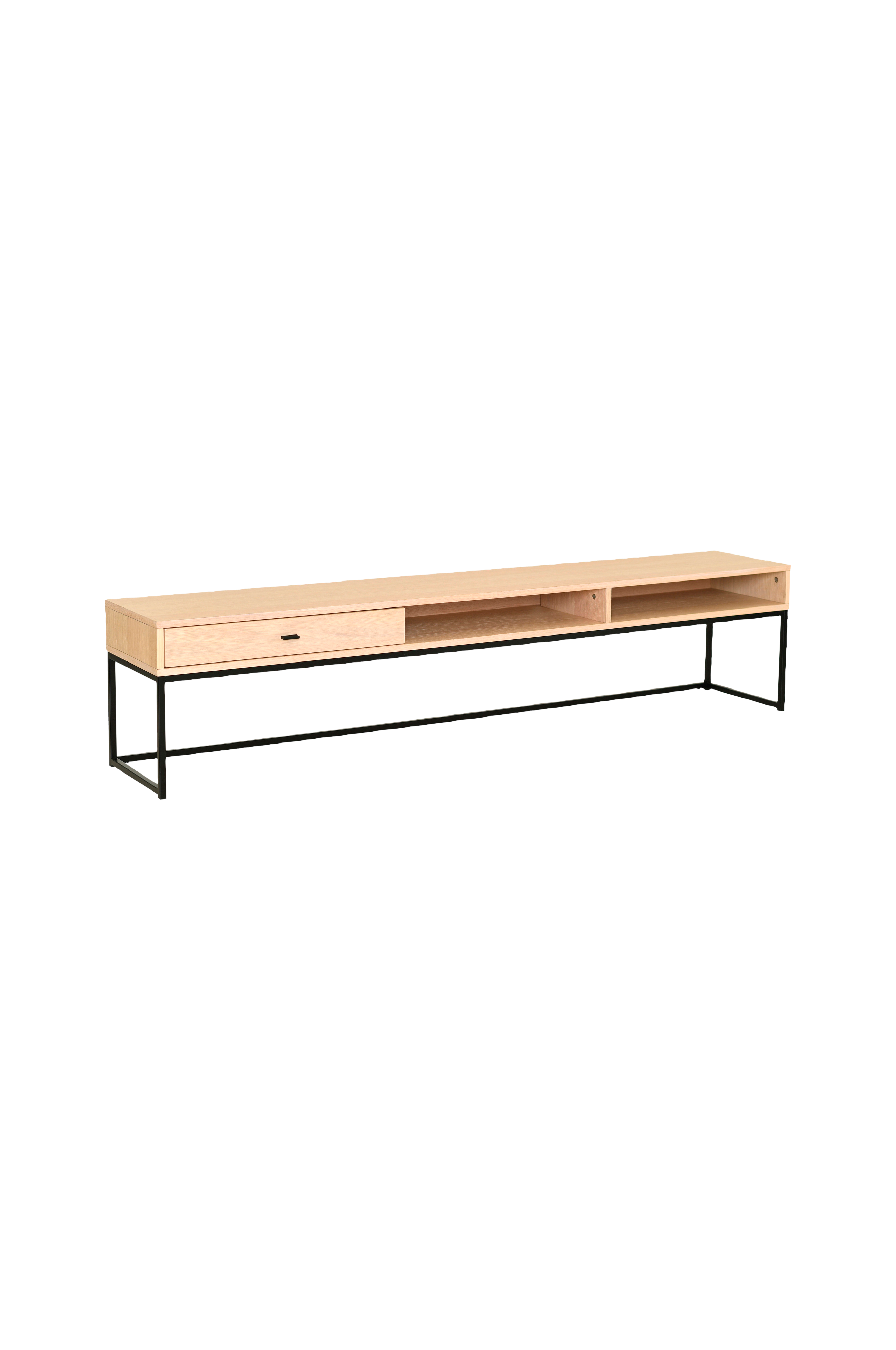 Moderne tv-bænk i lakeret eg og metal.