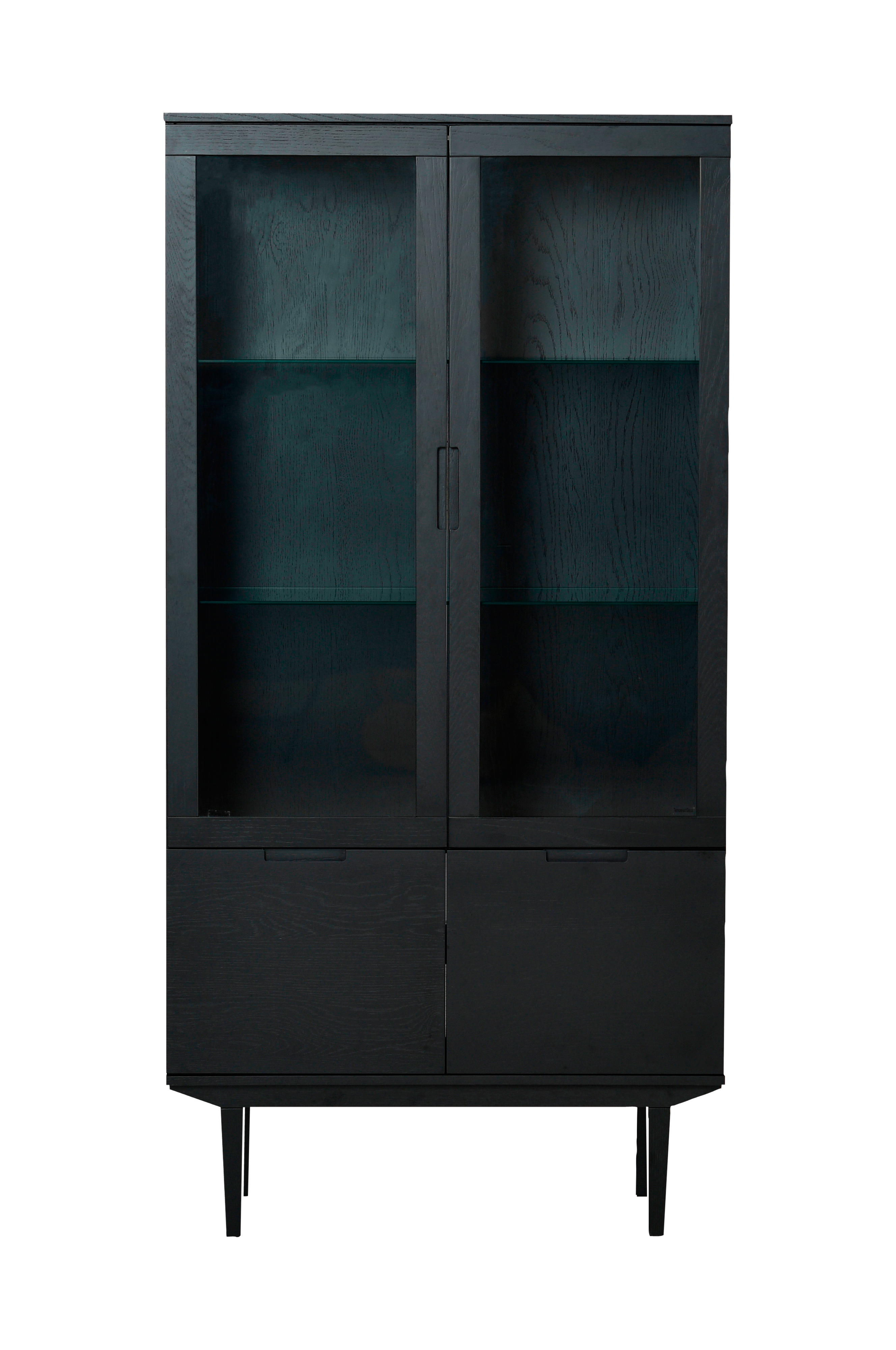 Dette stilfulde vitrineskab har en glat, lakeret egefinér, der fremhæver træets naturlige skønhed. Hvert skab er udstyret med soft-close-døre for et roligt og raffineret touch.