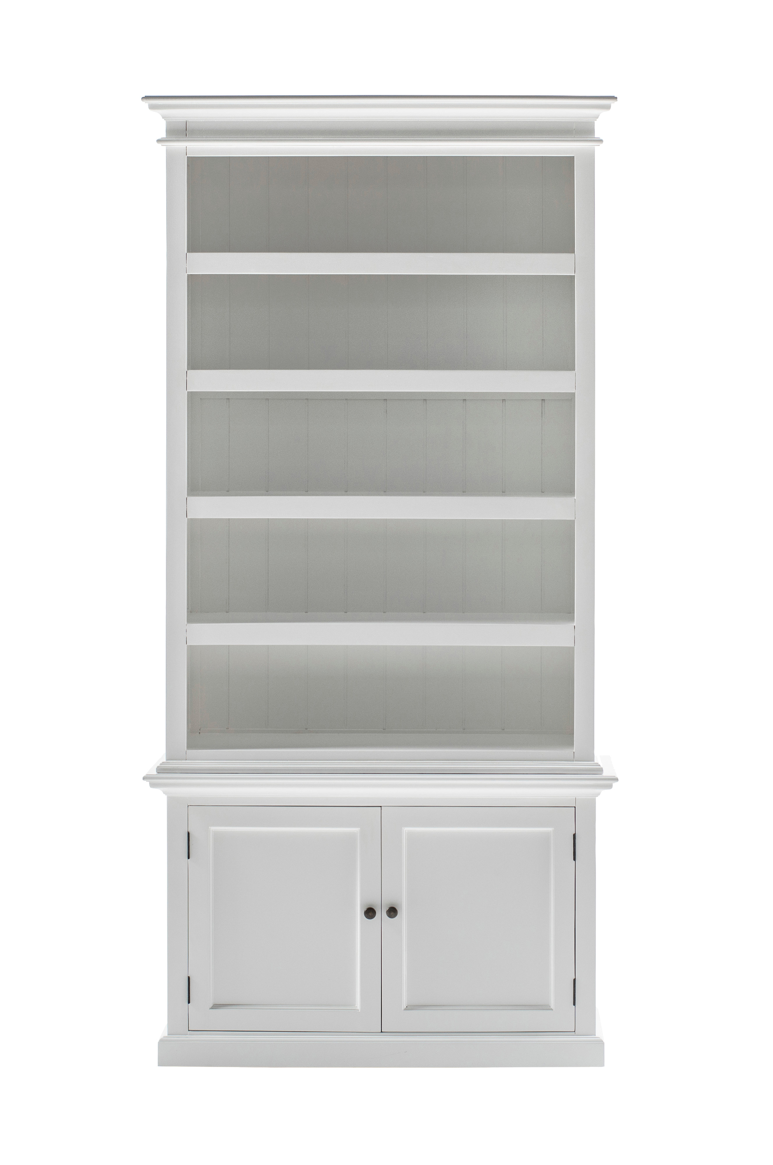 Man går aldrig galt i byen med et smukt skab i sit hjem, og dette er ingen undtagelse. Denne mahognihylde med klassisk hvid finish og antikke messingbeslag har fem åbne, faste hylder i den øverste del, to hylderum bag lågerne i shaker-stil og masser af personlighed. Dette statelige møbel ville være perfekt til en stue, spisestue eller endda et soveværelse, hvor det tilføjer opbevaring og et sted at udstille dyrebare ting.