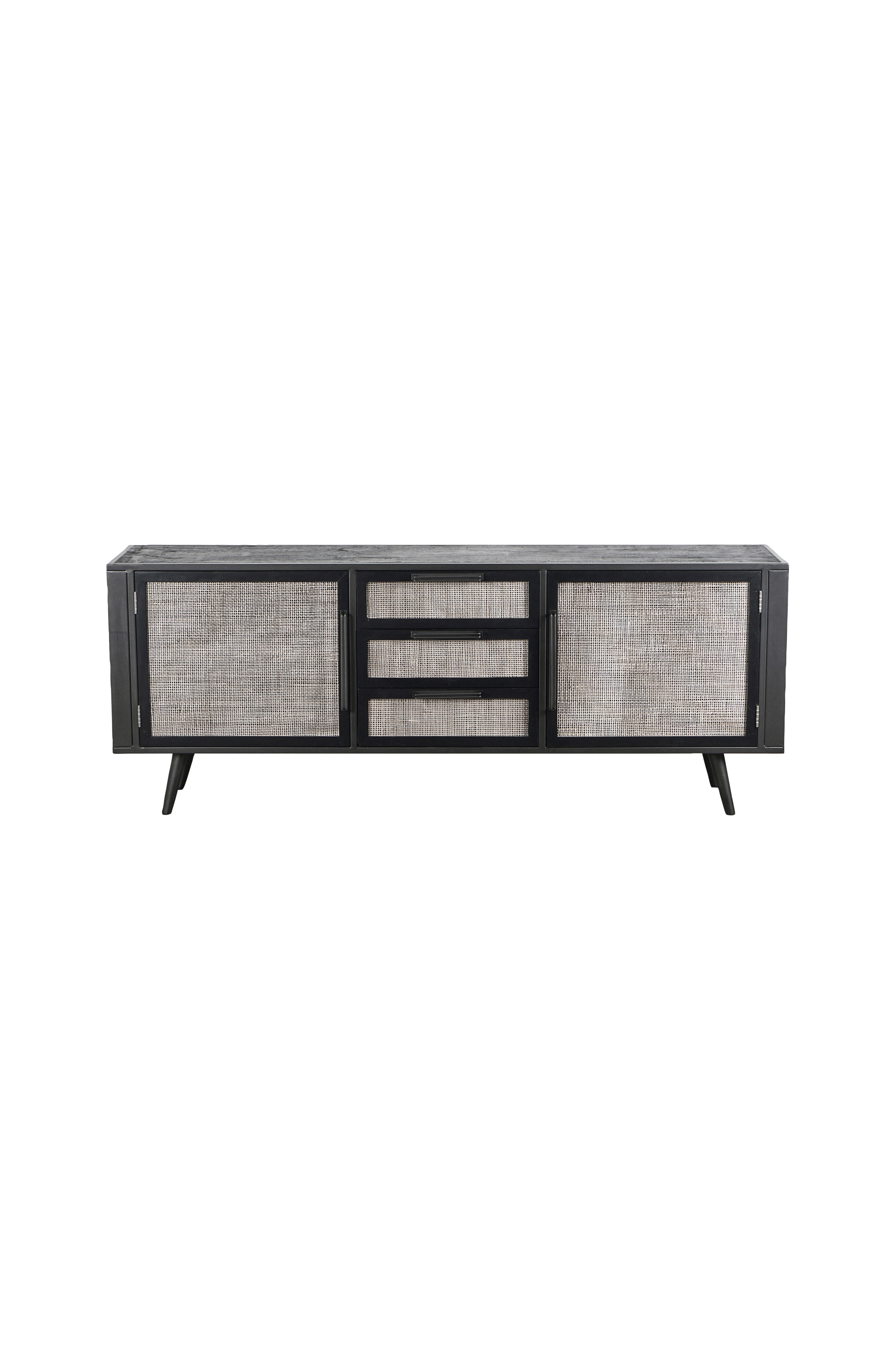 Denne skænk tilbyder smart alsidig opbevaring med sin kombination af generøse skuffer og faste hylder bag to store låger. Det er det ideelle møbel til stuen eller spisestuen til køkkenredskaber, sengetøj eller andre uundværlige ting i hjemmet. Den sorte vandbaserede maling afslører let den rustikke struktur i det underliggende træ. Håndvævet split rattan dør- og skuffefronter tilføjer et naturligt og ustruktureret look til hvert møbel.