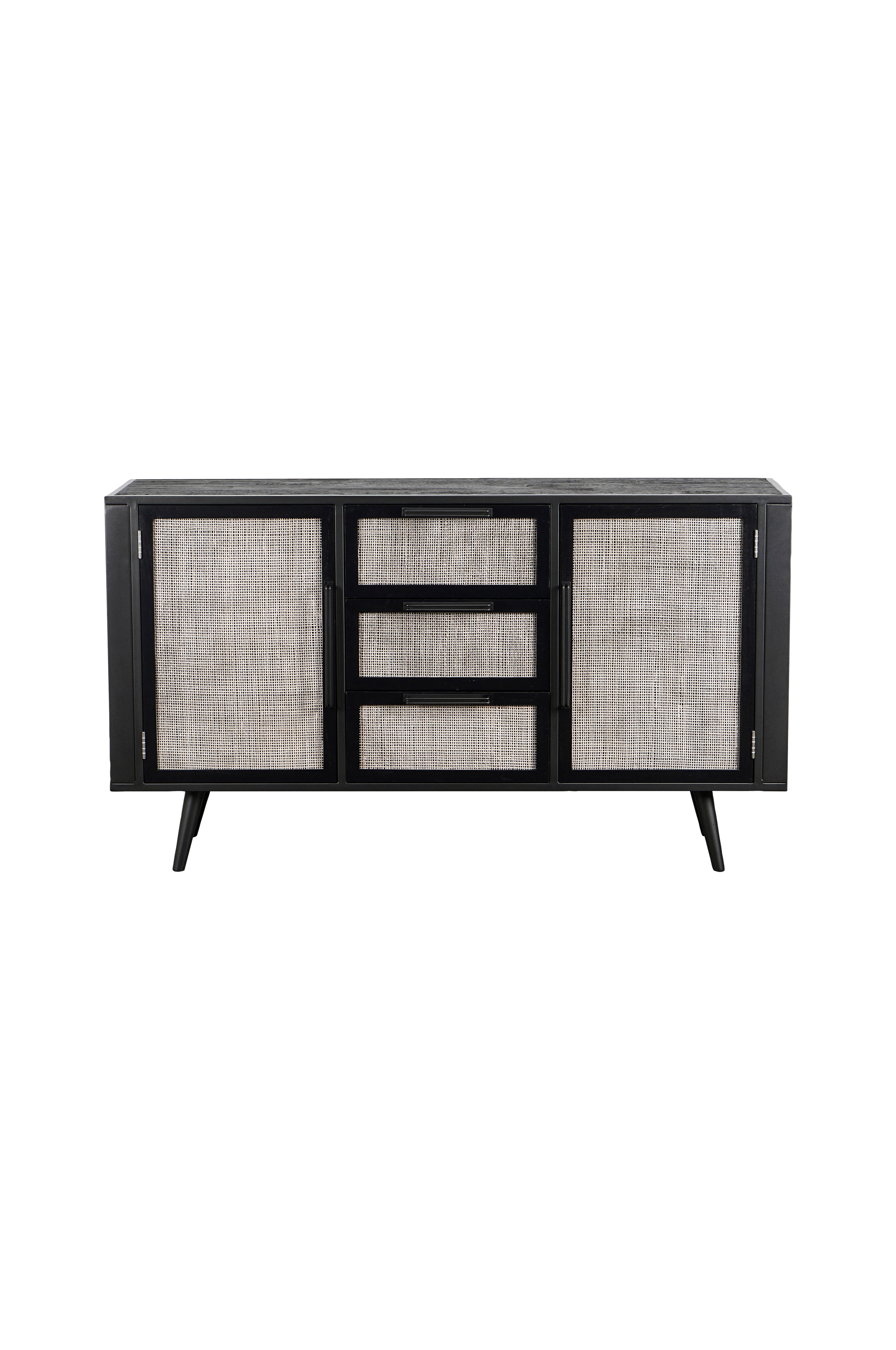 Denne skænk tilbyder smart alsidig opbevaring med sin kombination af generøse skuffer og faste hylder bag to store låger. Det er det ideelle møbel til stuen eller spisestuen til køkkenredskaber, sengetøj eller andre uundværlige ting i hjemmet. Den sorte vandbaserede maling afslører let den rustikke struktur i det underliggende træ. Håndvævet split rattan dør- og skuffefronter tilføjer et naturligt og ustruktureret look til hvert møbel.