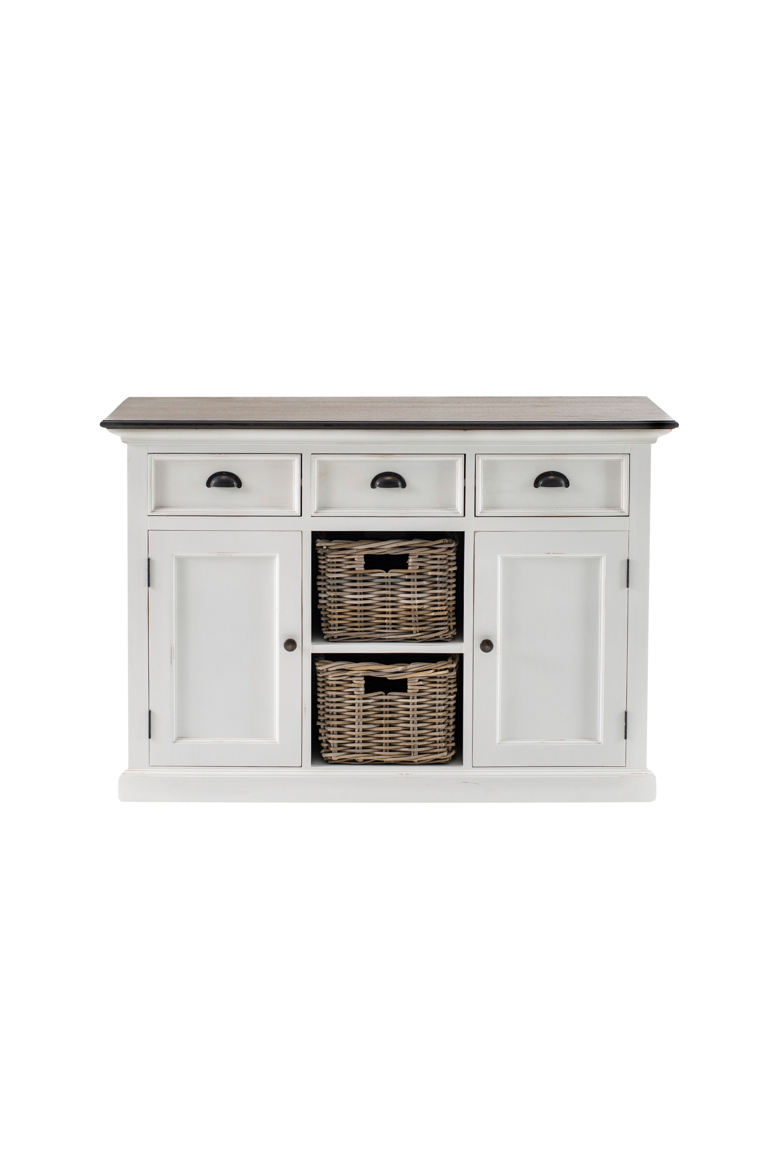 Denne variation af vores klassiske skænk tilbyder smarte opbevaringsmuligheder med sin kombination af generøse skuffer, håndvævede kurve og faste hylder bag låger i shaker-stil. Det er det ideelle møbel til stuen eller spisestuen til sengetøj, husgeråd eller vinglas. Vi har blotlagt træoverfladen og behandlet den med en dyb og mørk træbejdse, der reflekterer lyset. Vi har også givet lakken en lille smule slid, så den udstråler en vidunderlig, gammel stemning.