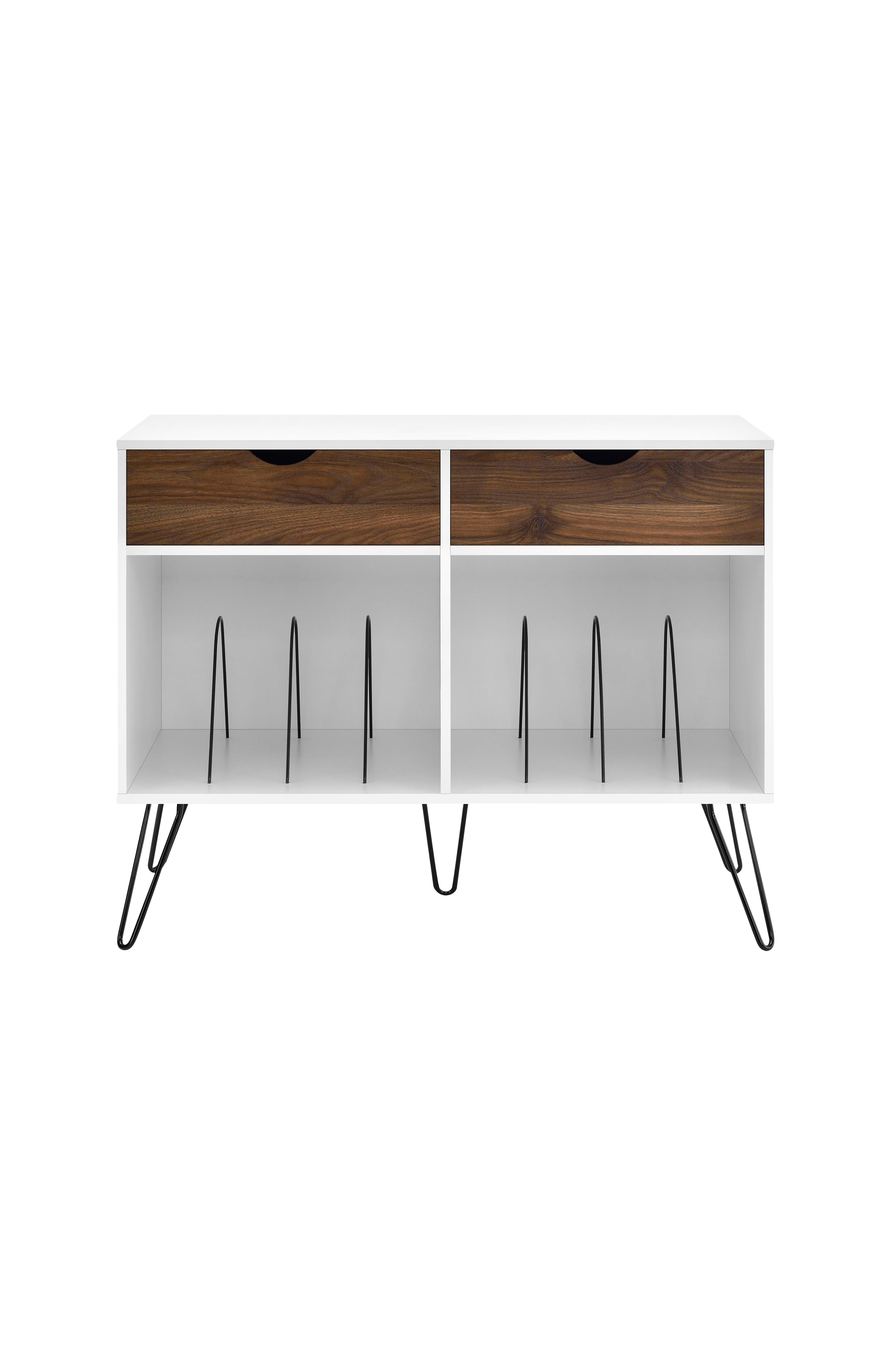 Skab retro vibes med bænken Concord Turntable Stand fra Novogratz med skuffer. Lamineret spånplade og MDF og sorte metalben skaber et sjovt retro-look. Kontrasten mellem det hvide og den mellembrune skuffefront passer godt til de fleste indretningsstile, fra moderne til klassisk. Der er god plads til pladespiller, højttalere, stereoanlæg eller nips. De to skuffer har plads til mindre gadgets som fjernbetjeninger og kassettebånd. De udskårne greb skaber et stilrent look og gør skufferne nemme at åbne. Organiser dine LP'er i de store rum med praktiske metaladskillere, der holder pladerne oprejst. Bænken leveres i en flad pakke og bør samles af to voksne. Bænken kan klare en vægt på op til 27 kg, mens rummene kan klare 9 kg hver. Hver skuffe kan rumme op til 6,8 kg. Efter samling måler bænken H81 x B101 x D46 cm.