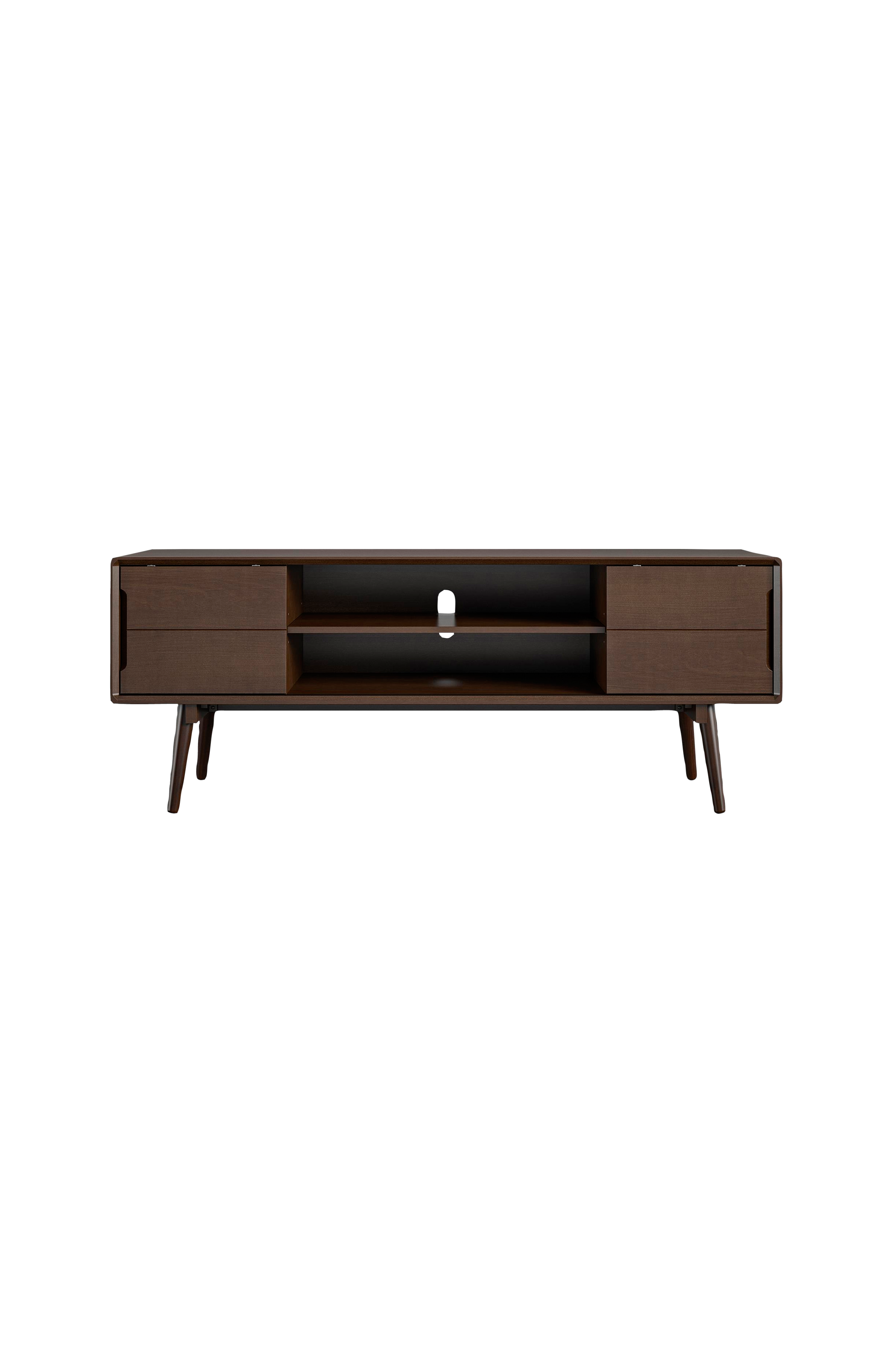 Opdater dagligstuen med tv-bænken Brittany fra Novogratz. Den passer til de fleste fladskærms-tv op til 55 tommer eller 43 kg. Bordpladens smukke træfiner med en valnøddefinish ser ud og føles som ægte træ og passer perfekt til de vinklede træben. De to midterste hylder har kabelgennemføring og er perfekte til dvd-afspillere, tv-bokse og lydanlæg. De to skydelåger skjuler to skabe, der giver endnu mere opbevaringsplads. Bænken leveres i en flad pakke og skal samles. Vi anbefaler, at to voksne samler produktet.