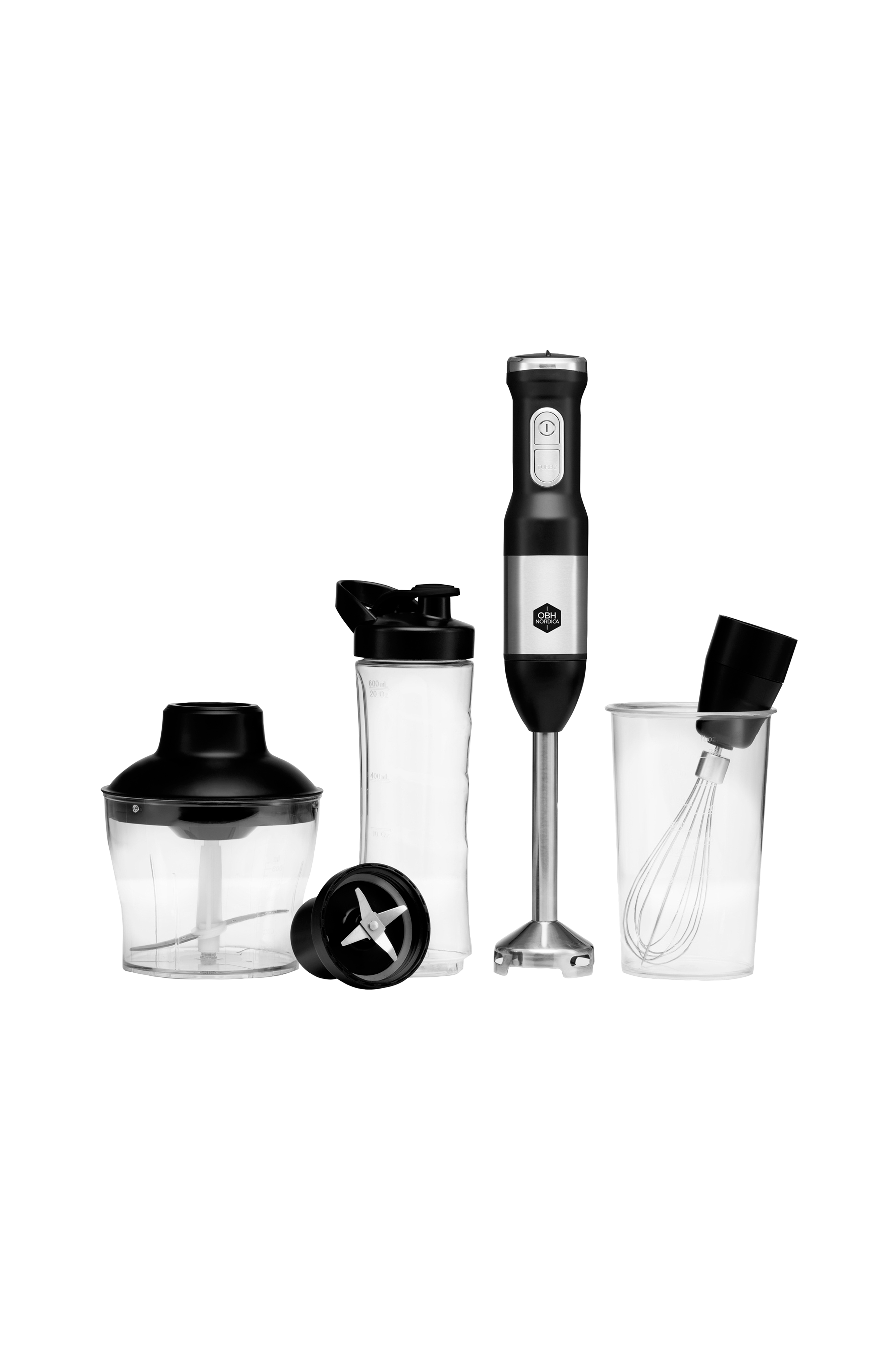 Stavblender og blender med take-away flaske, piskeris og minihakker til f.eks. grøntsager.