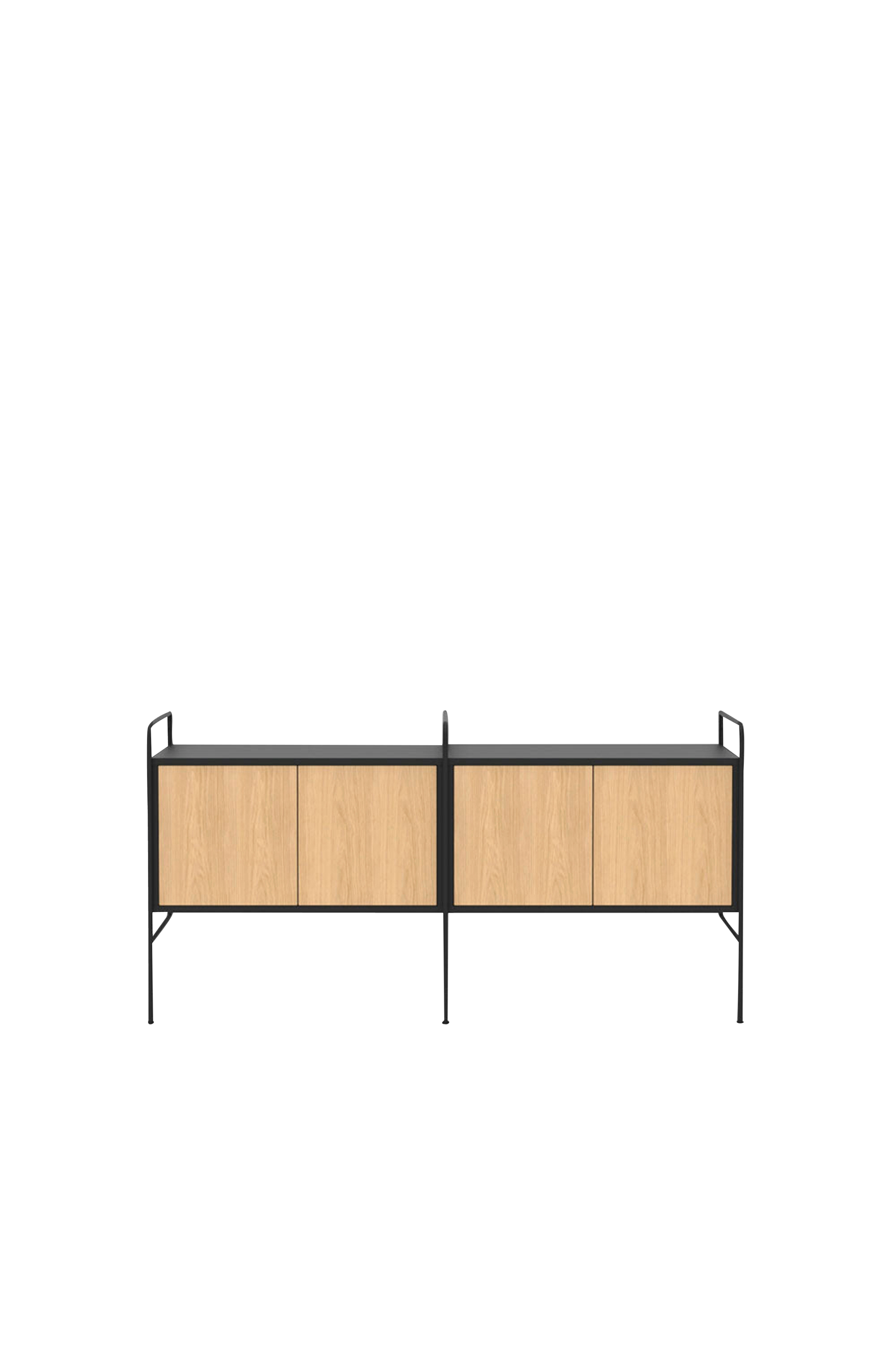 Skænk med skab. Fleksibelt, bygbart og skalerbart reol- og opbevaringssystem. Flere kombinationer med forskellige funktioner og farvemuligheder er tilgængelige. Design af Hans Thyge & Co. Stigerne er lavet af vandbaseret pulverlakeret metal med justerbare fødder. Skab i lakeret FSC-certificeret MDF.