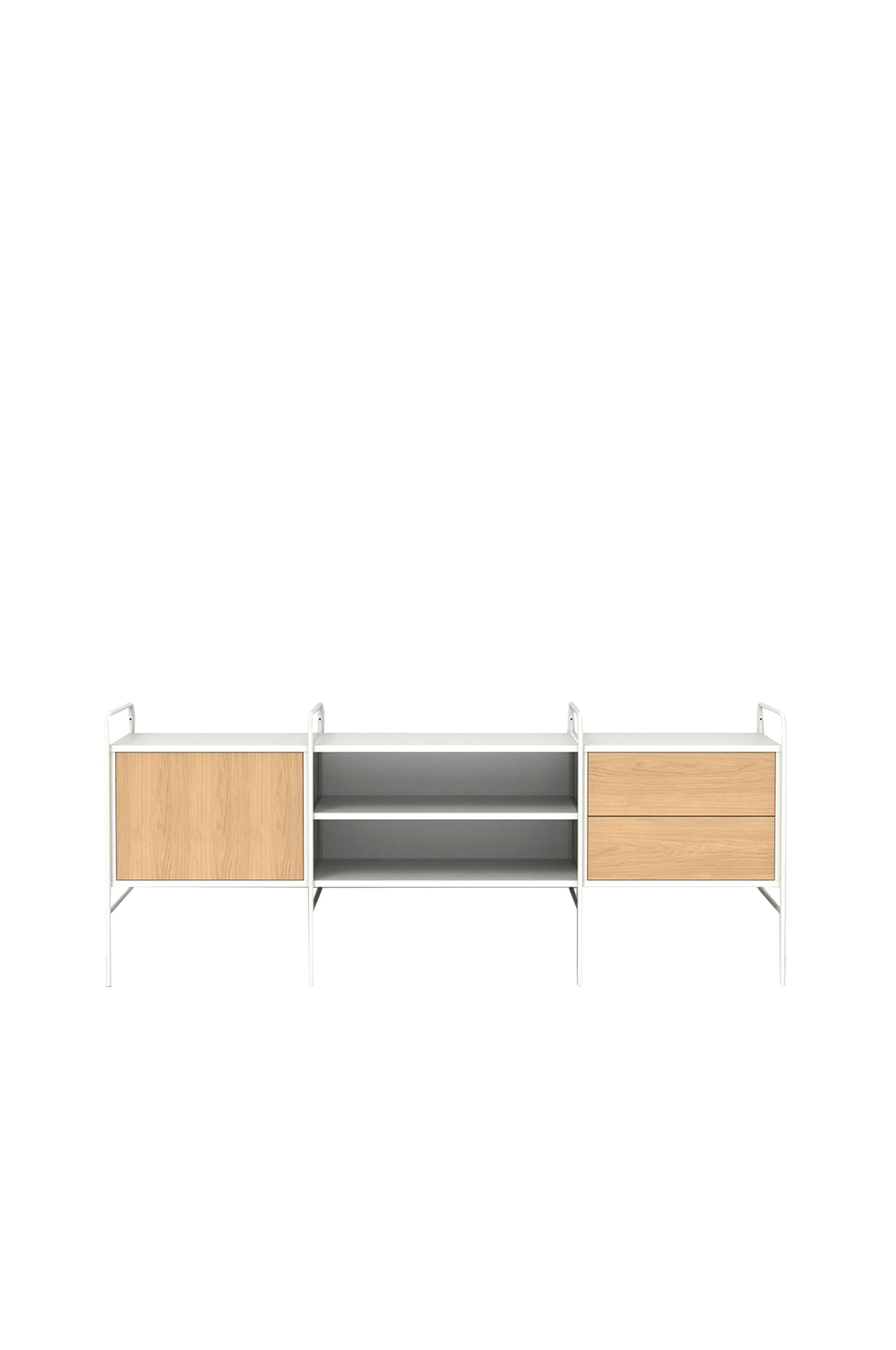 Skænk med skab og hylde. Fleksibelt, bygbart og skalerbart reol- og opbevaringssystem. Flere kombinationer med forskellige funktioner og farvemuligheder er tilgængelige. Design af Hans Thyge & Co. Stigerne er lavet af vandbaseret pulverlakeret metal med justerbare fødder. Skab og hylder i lakeret FSC-certificeret MDF.