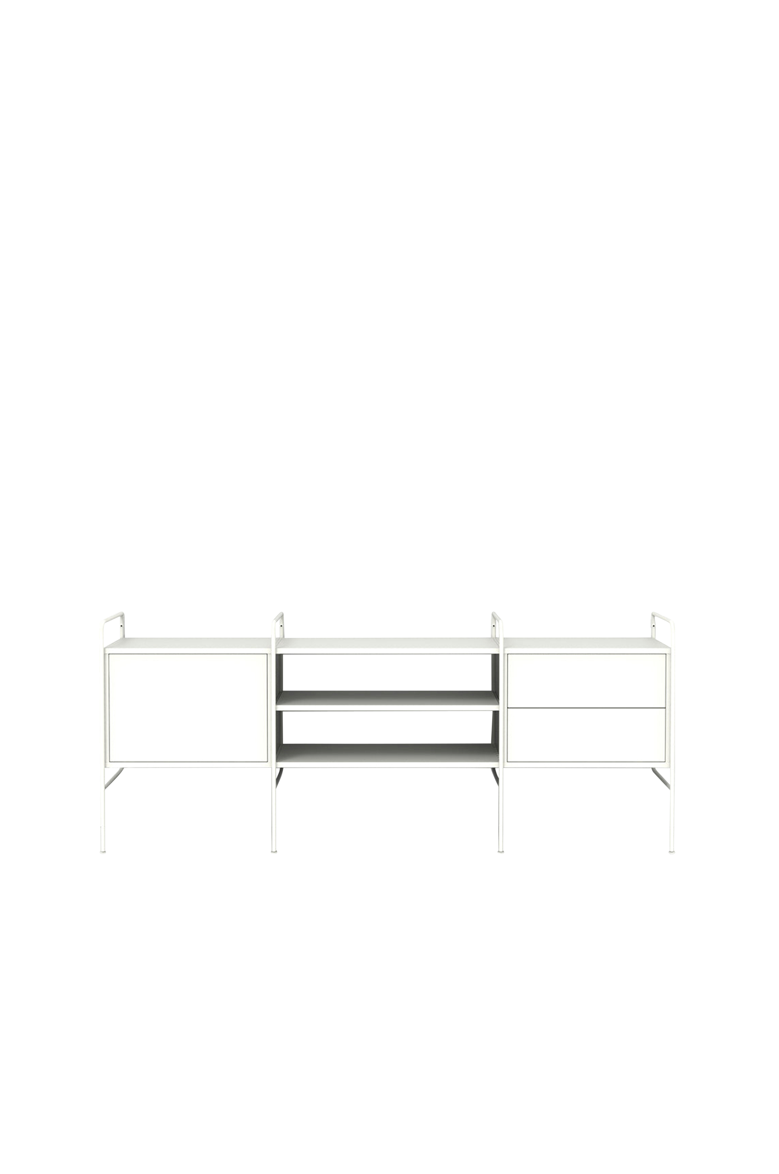 Skænk med skab og hylde. Fleksibelt, bygbart og skalerbart reol- og opbevaringssystem. Flere kombinationer med forskellige funktioner og farvemuligheder er tilgængelige. Design af Hans Thyge & Co. Stigerne er lavet af vandbaseret pulverlakeret metal med justerbare fødder. Skab og hylder i lakeret FSC-certificeret MDF.