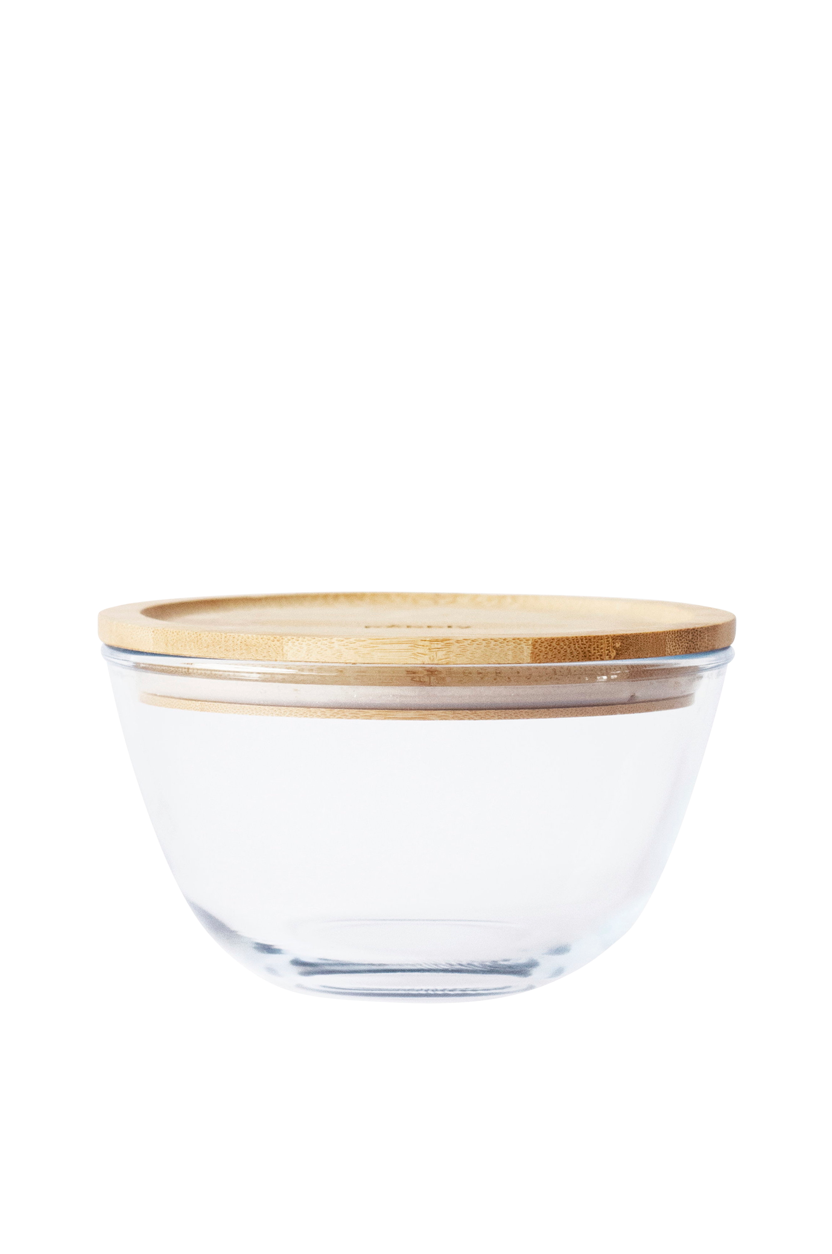 Denne runde glasskål har mange funktioner, som gør den nyttig i hverdagen! Glasskåle med lufttætte låg er perfekte til tilberedning, servering og opbevaring af mad. Denne beholder med bambuslåg er fremstillet af borosilikatglas af høj kvalitet og er holdbar, stilfuld og alsidig. Bambusstykkerne tåler ikke opvaskemaskine!