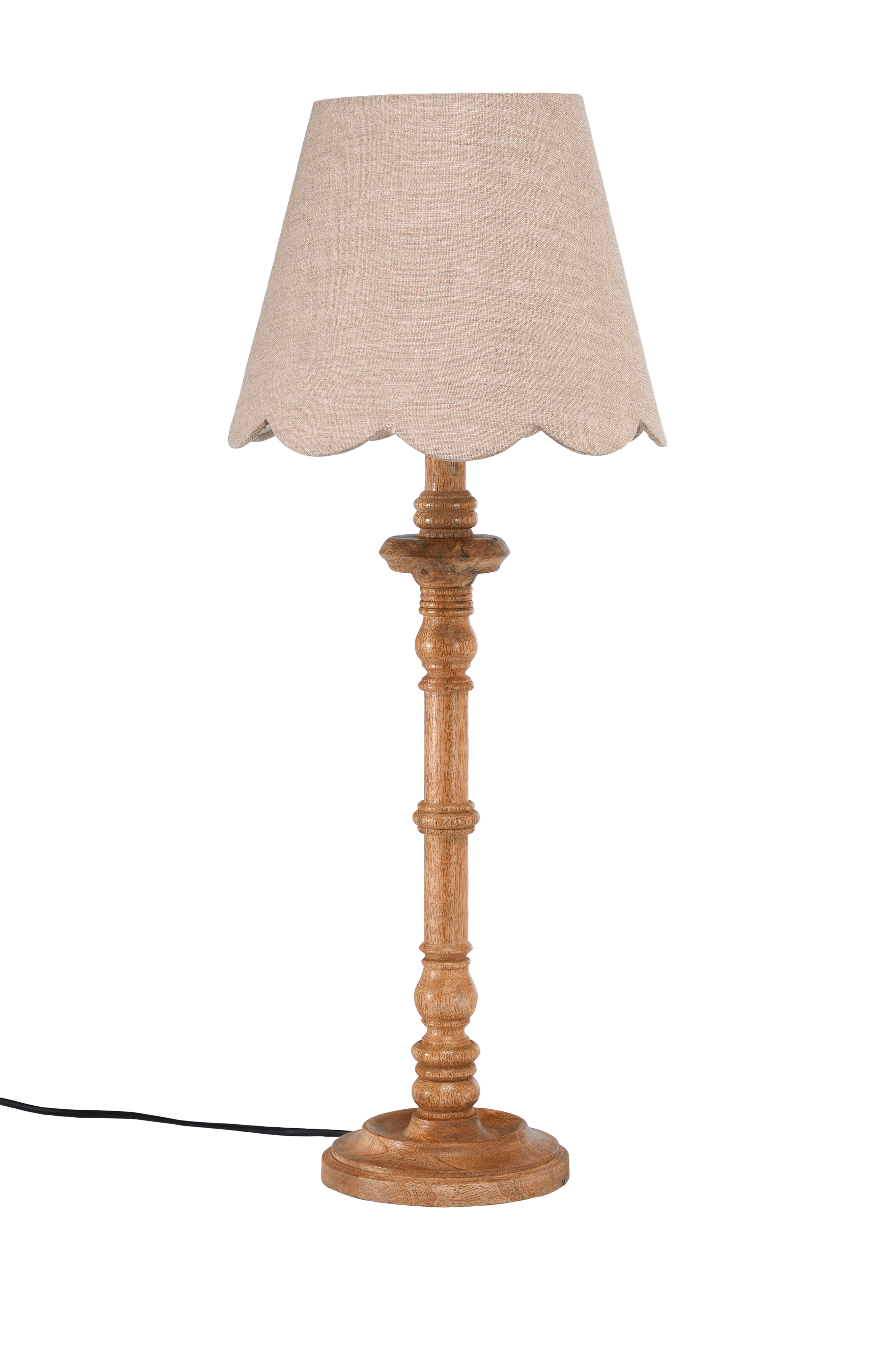 En dekorativ bordlampe inspireret af gamle lysestager. Lampefoden har en finish med naturlige variationer, der gør hver lampe unik. Skærmen er i hørstof med fin struktur, let A-formet og med en bølget form i bunden. 1,8 m plastledning med strømafbryder, E27-fatning.