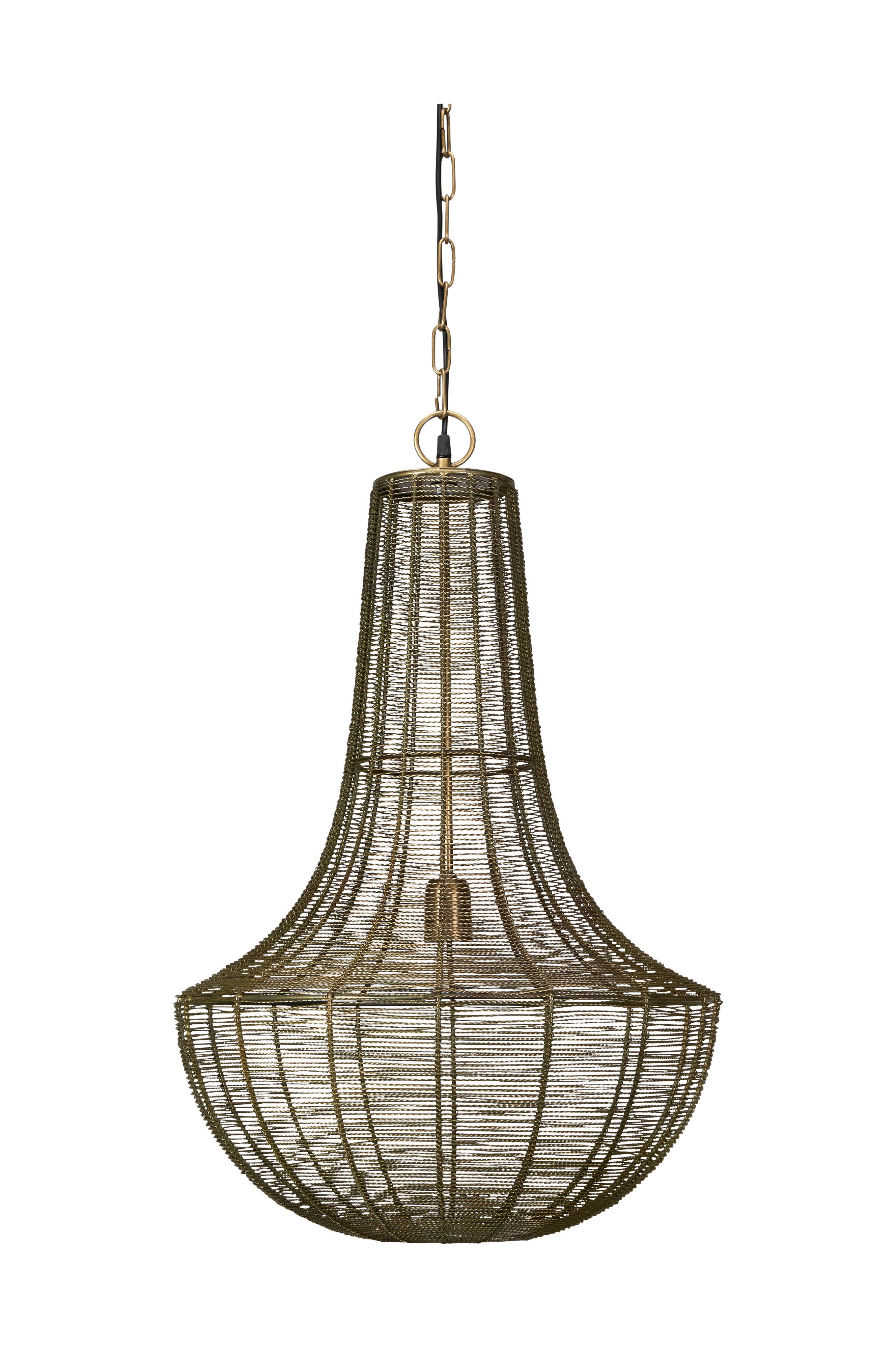 Loftlampe i snoet metaltråd, E27/stor sokkel. 40 W. 1,2 m kæde med baldakin i samme farve som lampen. 50 cm høj, 35 cm i diameter.Lampeudtag til loftet indgår ikke på grund af et nyt EU-direktiv. De kan bestilles separat.