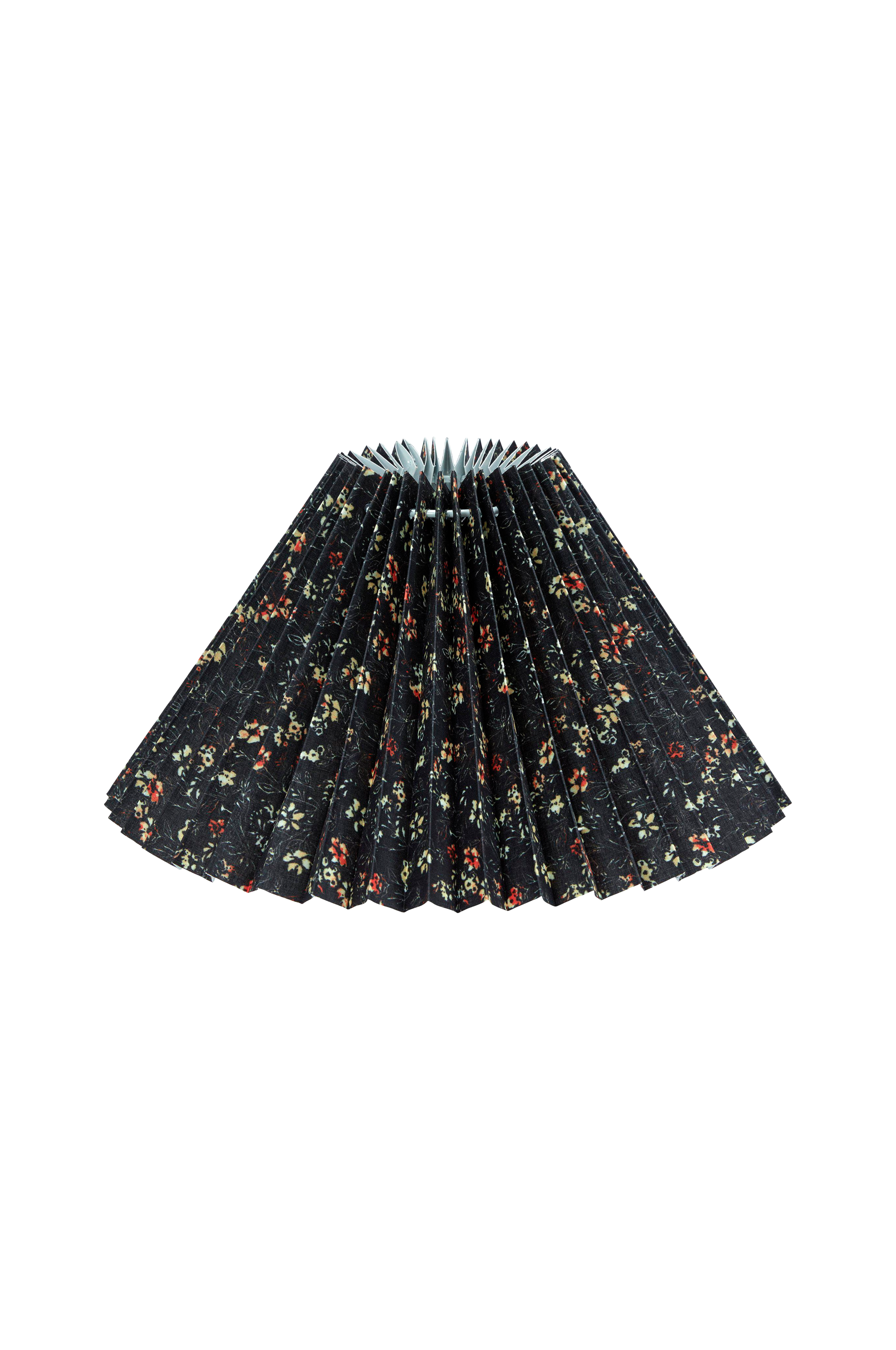 Ines plisserede lampeskærm, formen er let A-formet og har en inderside, der giver et smukt skær, når lampen er tændt. E27-bærering som sidder 5 cm fra bunden. Den smarte vendbare bærering gør, at skærmen kan bruges både til lampefødder og loftophæng eller læselamper. Diameter foroven 11 cm, diameter forneden 30 cm, højde 17 cm.